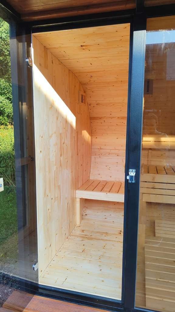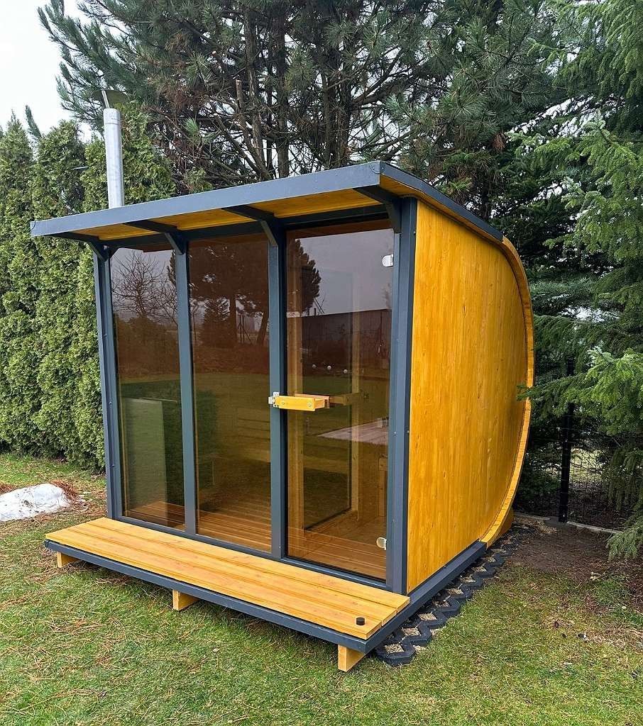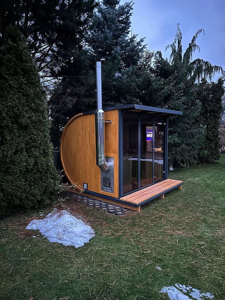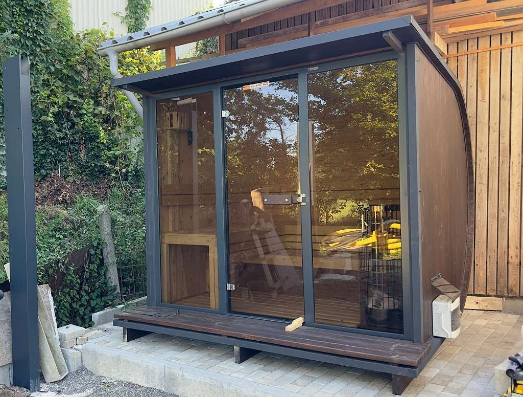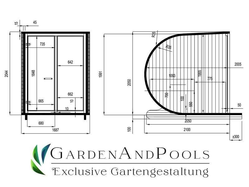 GardenAndPoolsCom Gartensauna Outdoorsauna Saunahaus Fass Sauna 2,4x2,4m Horizont M3