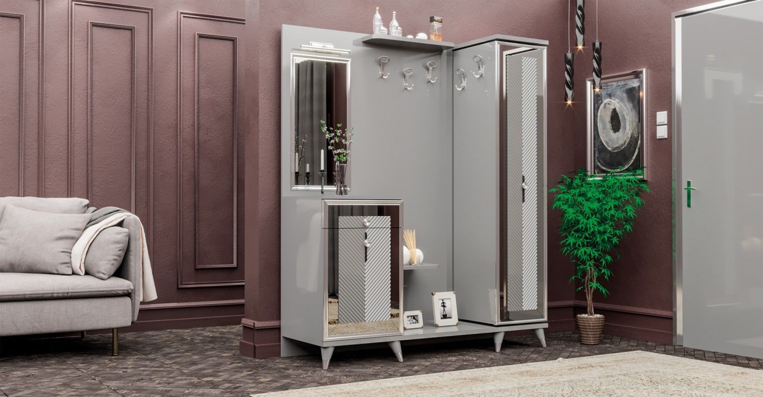 Garderobe Elmas in grau metallic D-EL Im Angebot enthalten: zeitlose Garderobe mit Spiegel 1x Garderobe Elmas Maße ca.: B H T: 155 x 190 x 42 cm Produktinformation: pflegeleichte Oberfläche MDF Holzwerkstoff grau metallic chrome Die Ware wird zerlegt geliefert und muss montiert werden. Ohne Dekor un