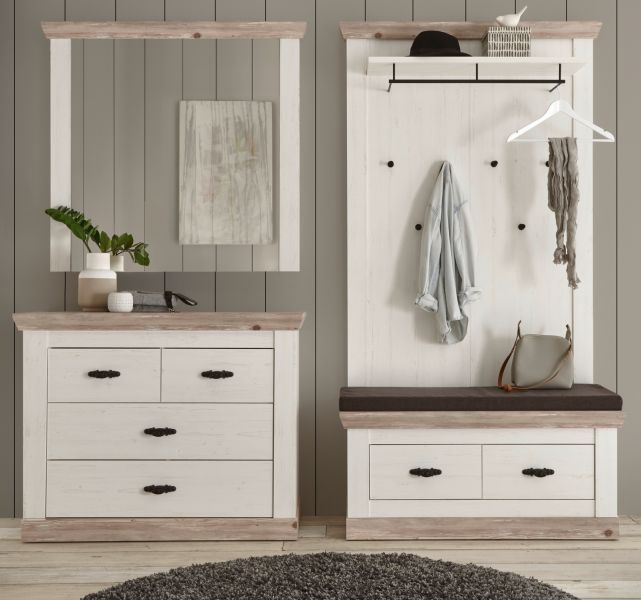Garderobe Flur Garderoben-Set weiß Pinie Landhaus Bank Kommode Paneel Spiegel Rovola