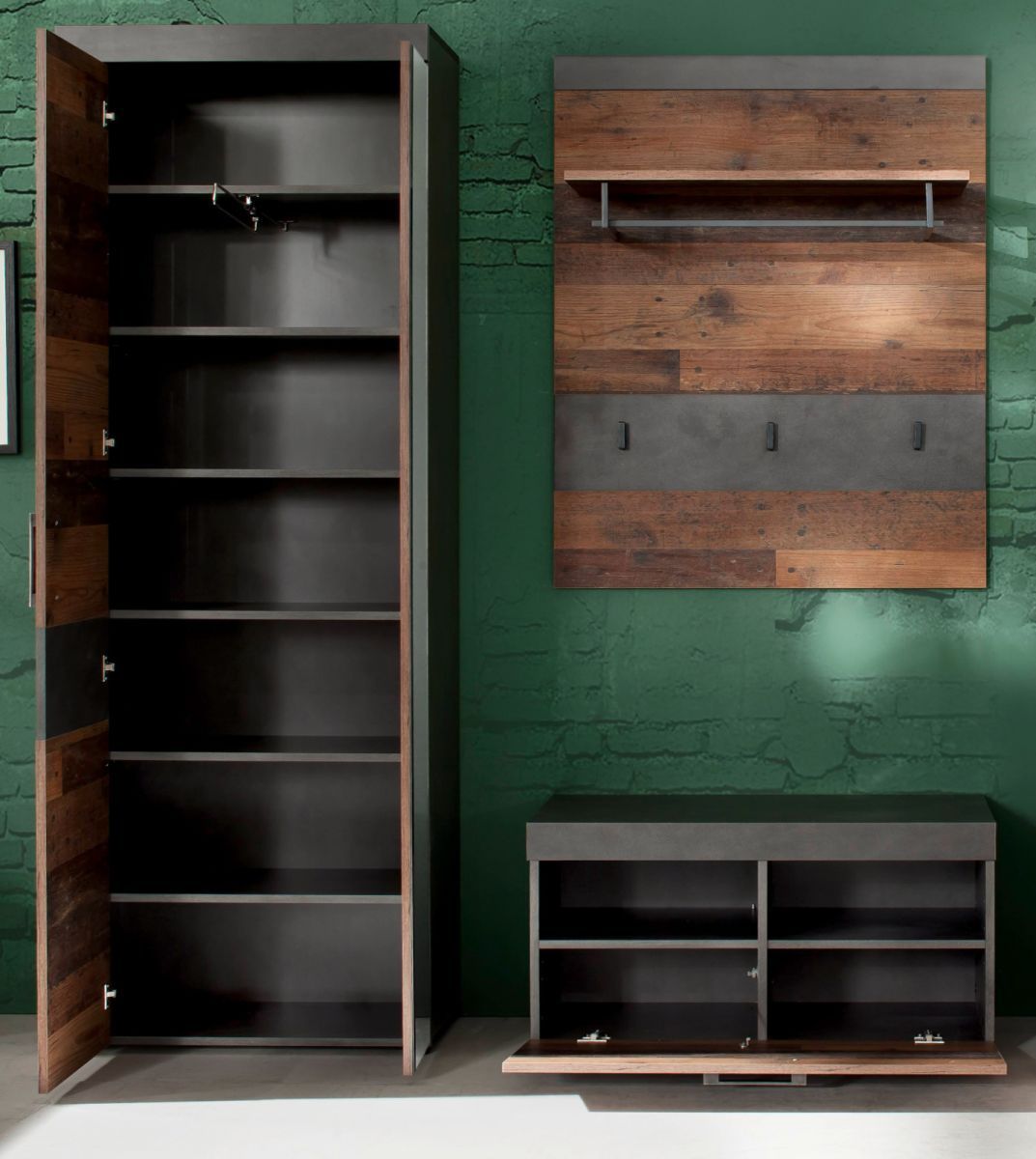 Trendteam Garderobe Indy 3-teilig in Used Wood Shabby mit Matera grau Garderobenset mit Schuh