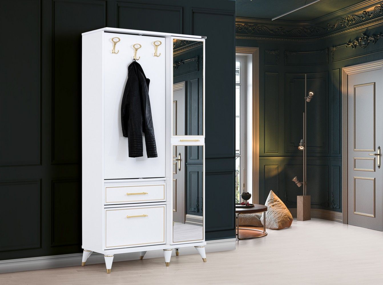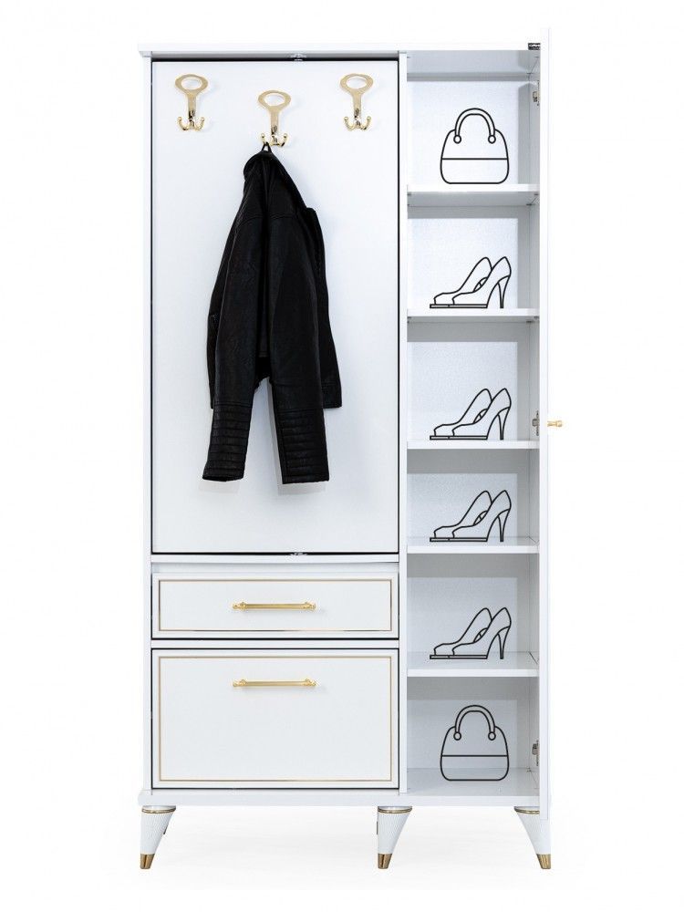 Garderobe Lilyum in weiss gold mit Spiegel Diele Flurschrank DE-L Im Angebot enthalten: Garderobe Lilyum 1x Garderobe Maße ca.: B H T: 100 x 200 x 45 cm mit Spiegel in weiss gold Produktinformation: pflegeleichte Oberfläche MDF Holzwerkstoff Die Ware wird zerlegt geliefert und muss montiert werden.