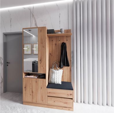 Garderobe ARTI Kleiderschrank mit Spiegel, Kleiderstange, 2 Schubladen, Sitzkissen