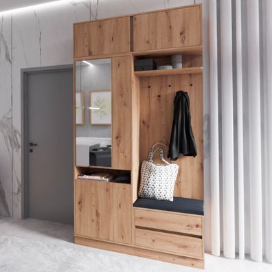 Garderobe ARTI N Kleiderschrank mit Spiegel, Kleiderstange, 2 Schubladen, Sitzkissen