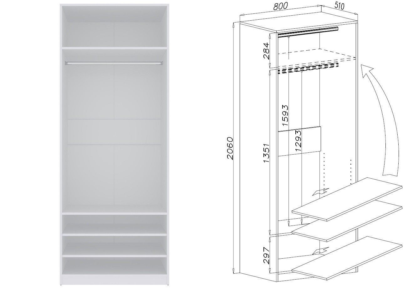 Garderobenschrank TRES 03B offener Kleiderschrank mit Kleiderstange und Fächer