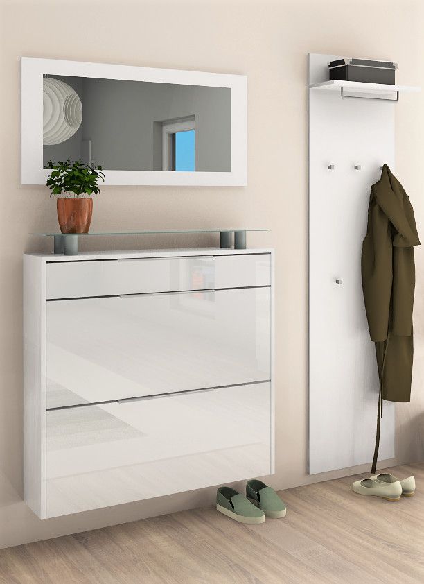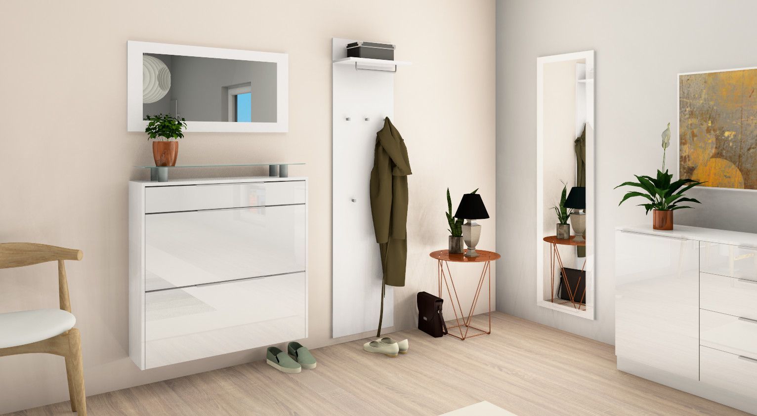 Garderobenset Weiß Hochglanz Garderobe Schuhschrank Paneel Spiegel Flur Diele Oliva 2