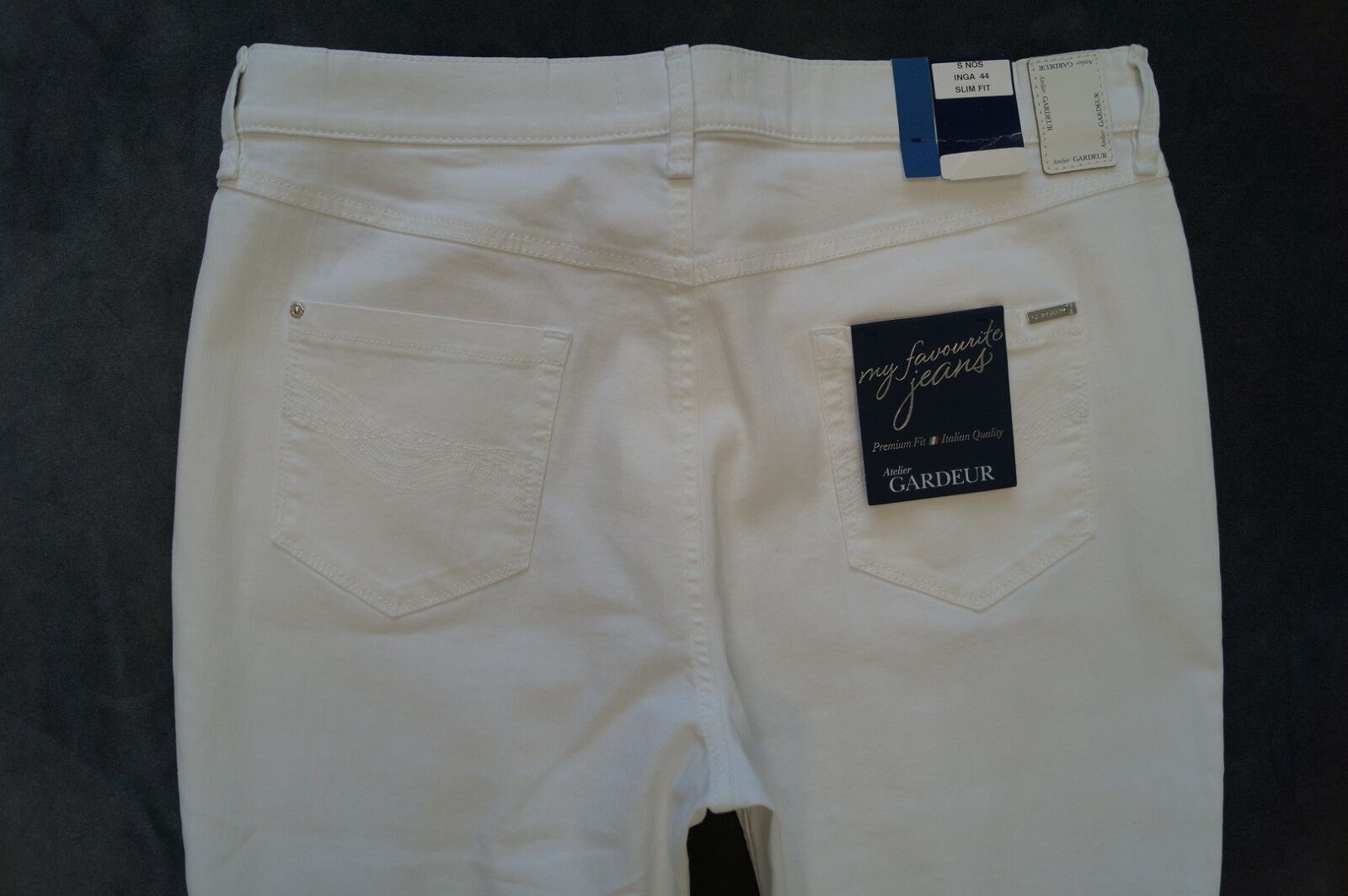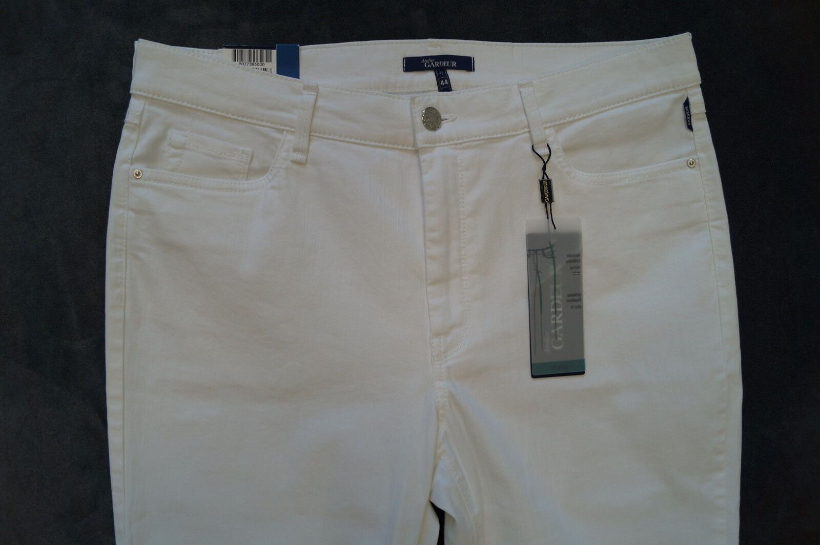 Atelier GARDEUR Modell:*INGA* Jeans Größe: 44 Länge: Regular Farbe: weiß Material: 88%Baumwolle,10%Polyester,2%Elasthan Italian Qualität - schlanke Passform - normale Leibhöhe, - Slim Fit, - gerades Bein NEU mit Etikett UVP: 79,95 Euro Rechtlicher Hinweis Zur Beschreibung der angebotenen Ware ist es