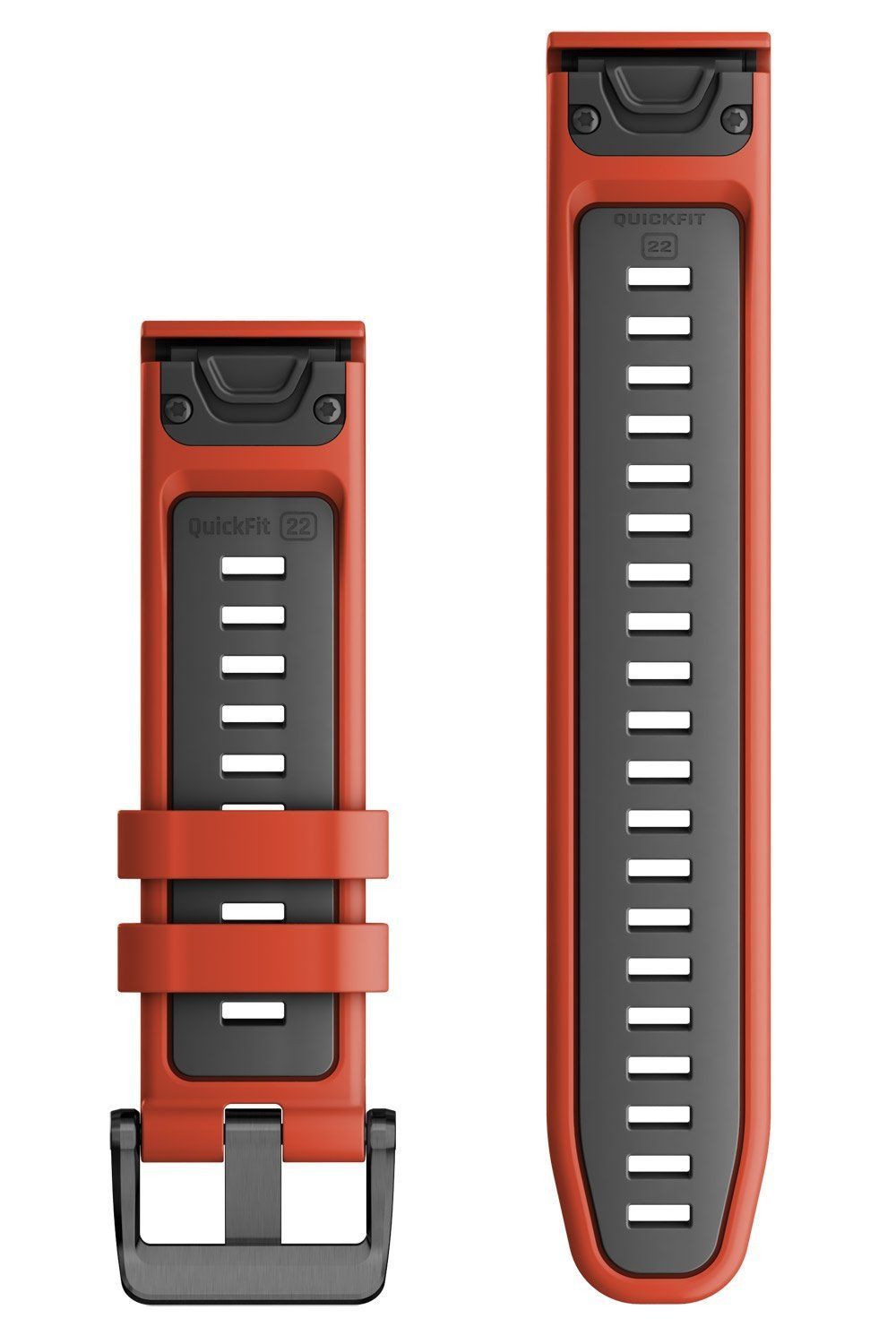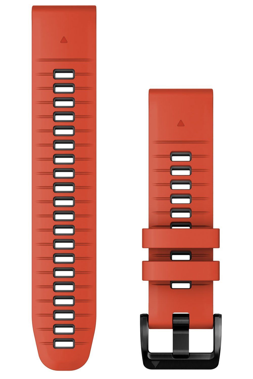 Wechsel-Armband für Garmin Smartwatches aus rotem Silikon, dunkelgraue Innenseite, mit 2 Schlaufen, das Einstellband ist 12,4 cm lang, das Schnallenband ist 9,5 cm lang. Berechnen Sie bei der Bestimmung des richtigen Armbandes die Länge des Uhrengehäuses mit ein, Breite 22 mm, matte Edelstahl-Dornschließe, schwarz plattiert, das Ersatzband kann einfach und ohne Werkzeug gewechselt werden, geeignet für die Modelle: fenix 47 mm, epix 47 mm, quatix 47 mm, Instinct 2, D2 47 mm, Approach 47 mm