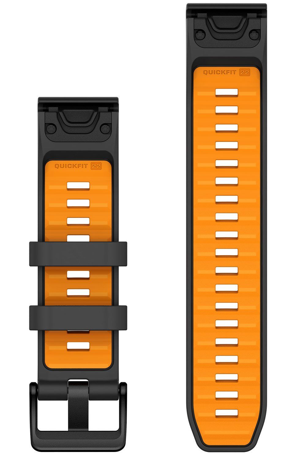 Wechsel-Armband für Garmin Smartwatches aus dunkelgrauem Silikon, orangefarbene Innenseite, mit 2 Schlaufen, das Einstellband ist 12,4 cm lang, das Schnallenband ist 9,5 cm lang, berechnen Sie bei der Bestimmung des richtigen Armbandes die Länge des Uhrengehäuses mit ein, Breite 22 mm, matte Edelstahl-Dornschließe, schwarz plattiert, kann einfach und ohne Werkzeug gewechselt werden, geeignet für die Modelle: fenix 47 mm, epix 47 mm, quatix 47 mm, Instinct 2, D2 47 mm, Approach 47 mm