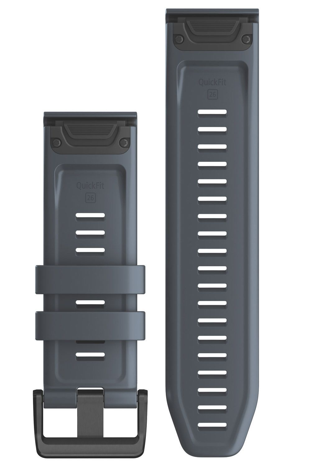 Wechsel-Armband aus graublauem Silikon, mit 2 Schlaufen, das Einstellband ist 12,8 cm lang, das Schnallenband ist 9,5 cm lang. Berechnen Sie bei der Bestimmung des richtigen Armbandes die Länge des Uhrengehäuses mit ein, Breite 26 mm, matte Edelstahl-Dornschließe, schwarz plattiert, kann einfach und ohne Werkzeug gewechselt werden, geeignet für die Modelle: fenix 51 mm, tactix, epix 51 mm, quatix 51 mm, Instinct 2X, D2 51 mm, Descent 51 mm, Enduro
