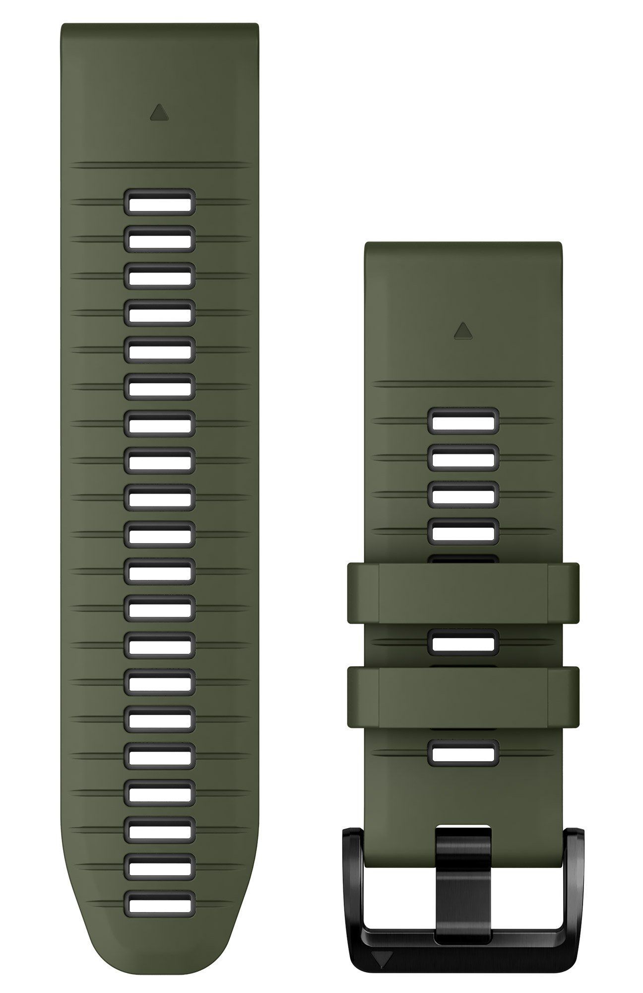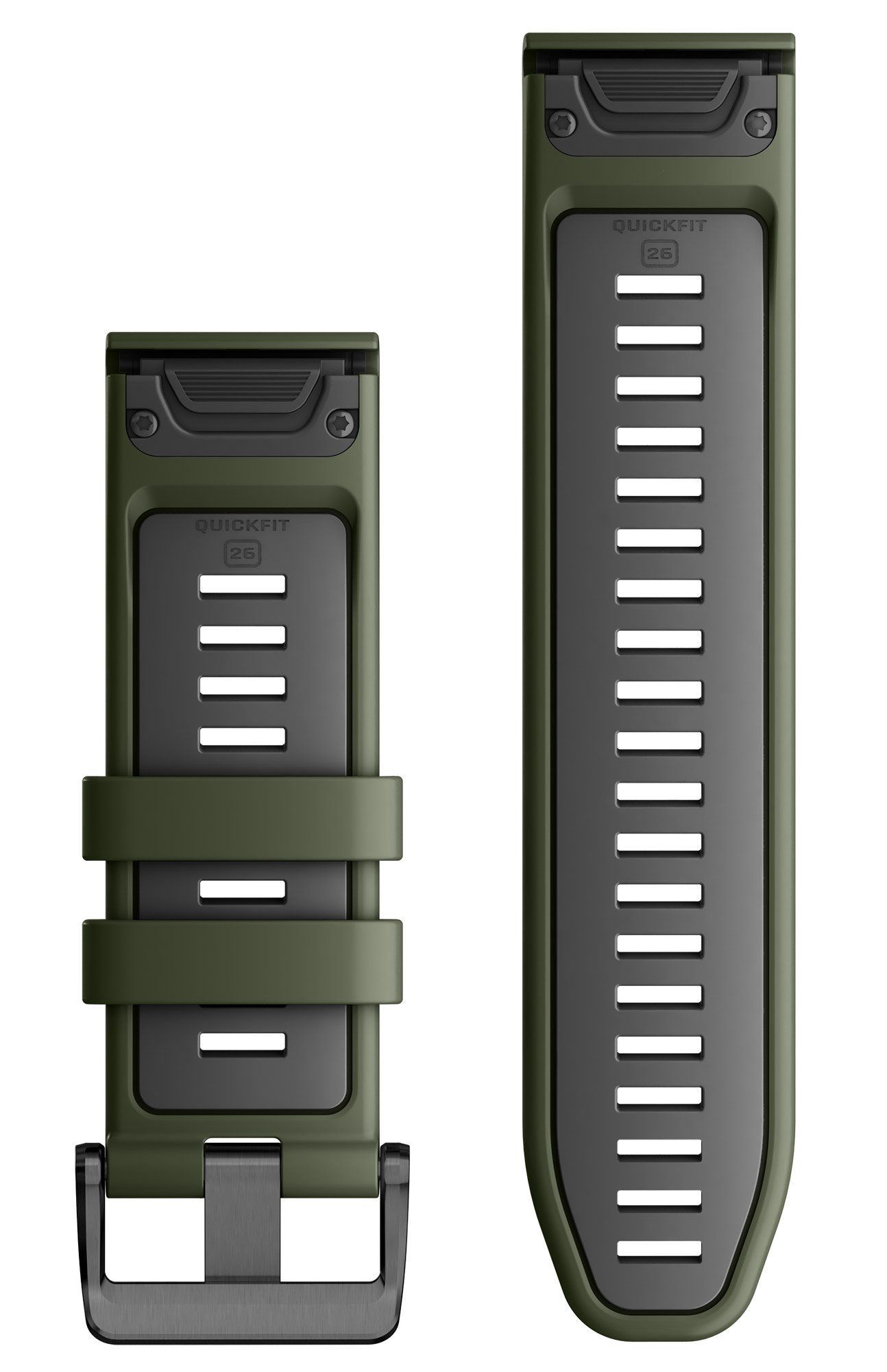Wechsel-Armband für Garmin Smartwatches aus moosgrünem Silikon, dunkelgraue Innenseite, das Einstellband ist 12,4 cm lang, das Schnallenband ist 9,5 cm lang. Berechnen Sie bei der Bestimmung des richtigen Armbandes die Länge des Uhrengehäuses mit ein, Breite 26 mm, matte Edelstahl-Dornschließe, schwarz plattiert, das Ersatzband kann einfach und ohne Werkzeug gewechselt werden, geeignet für die Modelle: fenix 51 mm, tactix, epix 51 mm, quatix 51 mm, Instinct 2X, D2 51 mm, Descent 51 mm, Enduro