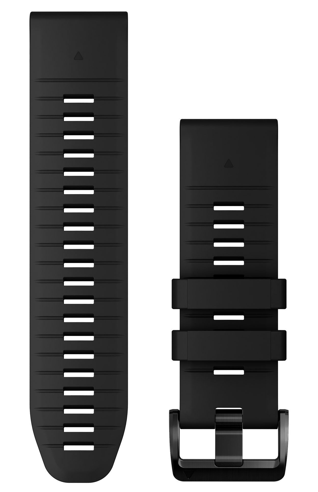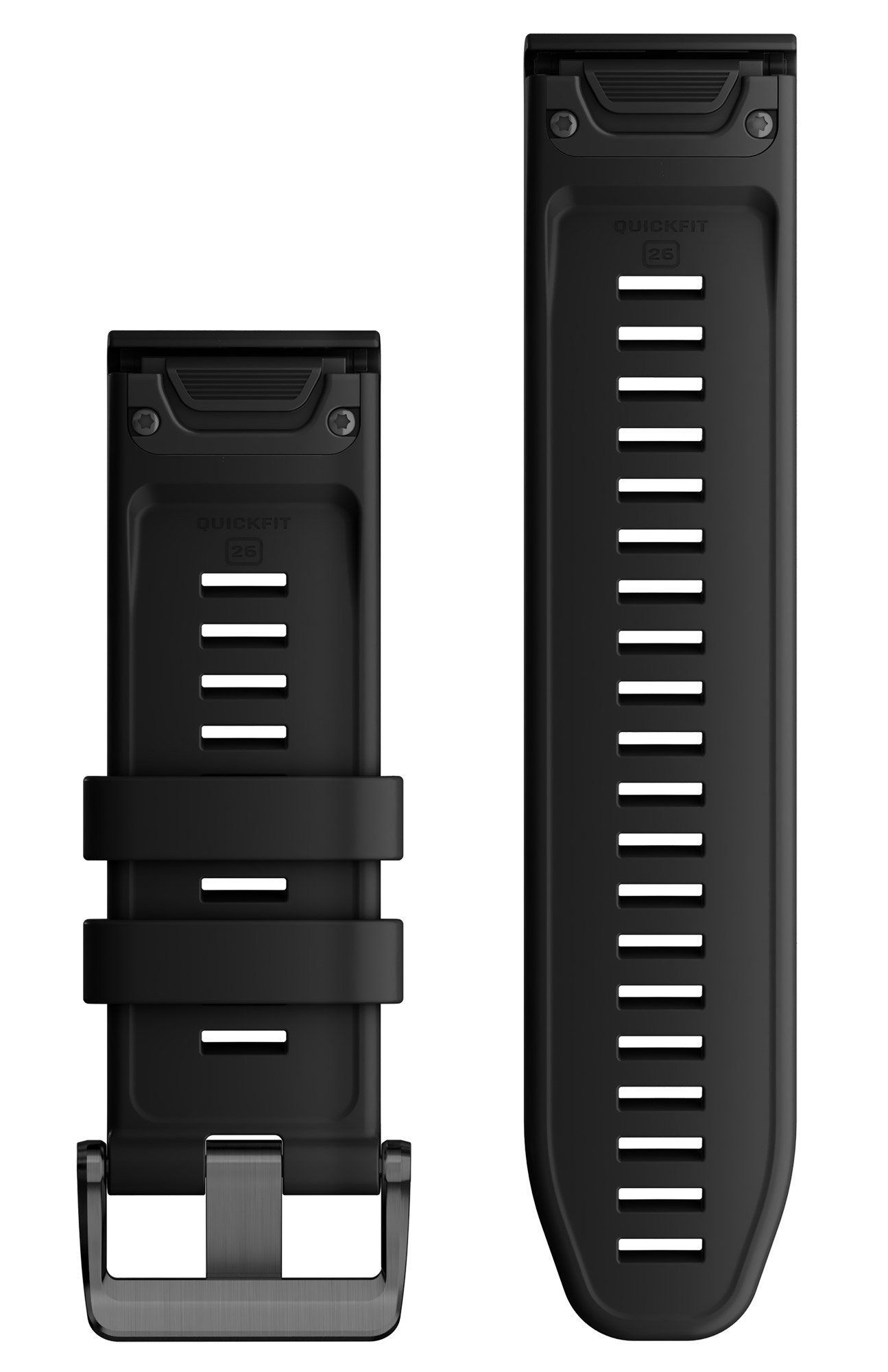 Wechsel-Armband für Garmin Smartwatches aus schwarzem Silikon, mit 2 Schlaufen, das Einstellband ist 12,4 cm lang, das Schnallenband ist 9,5 cm lang. Berechnen Sie bei der Bestimmung des richtigen Armbandes die Länge des Uhrengehäuses mit ein, Breite 26 mm, matte Edelstahl-Dornschließe, schwarz plattiert, das Ersatzband kann einfach und ohne Werkzeug gewechselt werden, geeignet für die Modelle: fenix 51 mm, tactix, epix 51 mm, quatix 51 mm, Instinct 2X, D2 51 mm, Descent 51 mm, Enduro