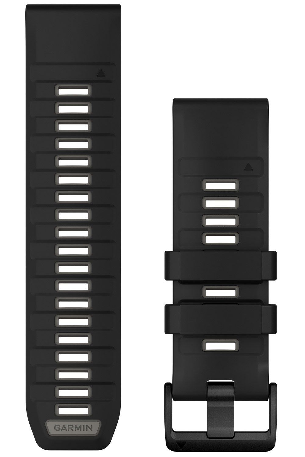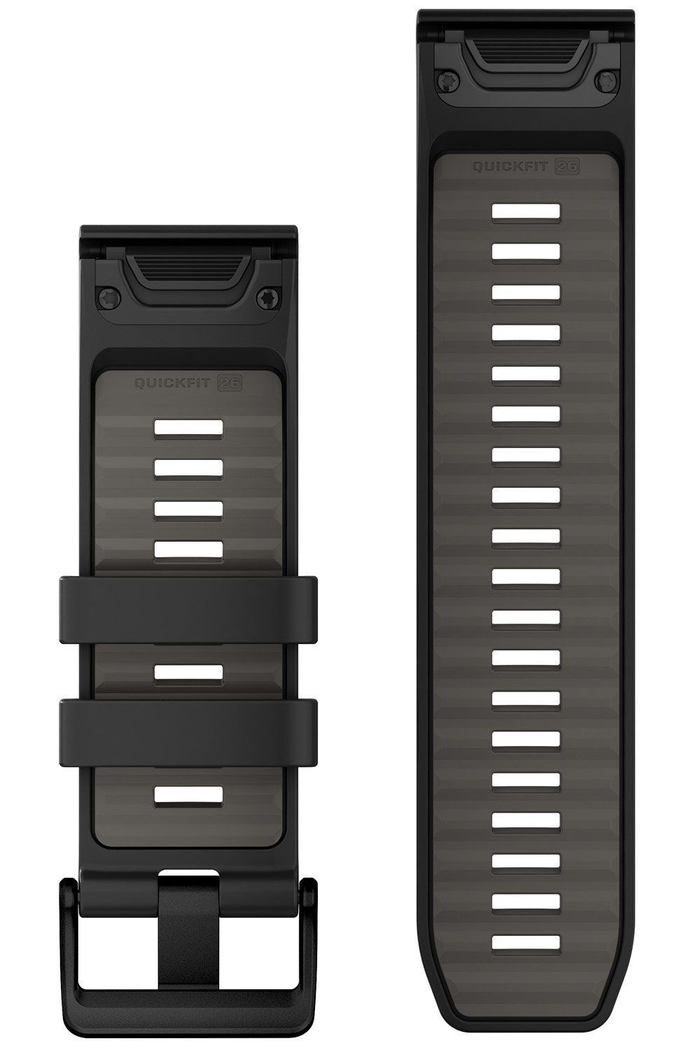 Wechsel-Armband für Garmin Smartwatches aus schwarzem Silikon, hellgraue Innenseite, mit 2 Schlaufen, das Einstellband ist 12,4 cm lang, das Schnallenband ist 9,5 cm lang, berechnen Sie bei der Bestimmung des richtigen Armbandes die Länge des Uhrengehäuses mit ein, Breite 26 mm, matte Edelstahl-Dornschließe, schwarz plattiert, kann einfach und ohne Werkzeug gewechselt werden, geeignet für die Modelle: fenix 51 mm, tactix, epix 51 mm, quatix 51 mm, Instinct 2X, D2 51 mm, Descent 51 mm, Enduro
