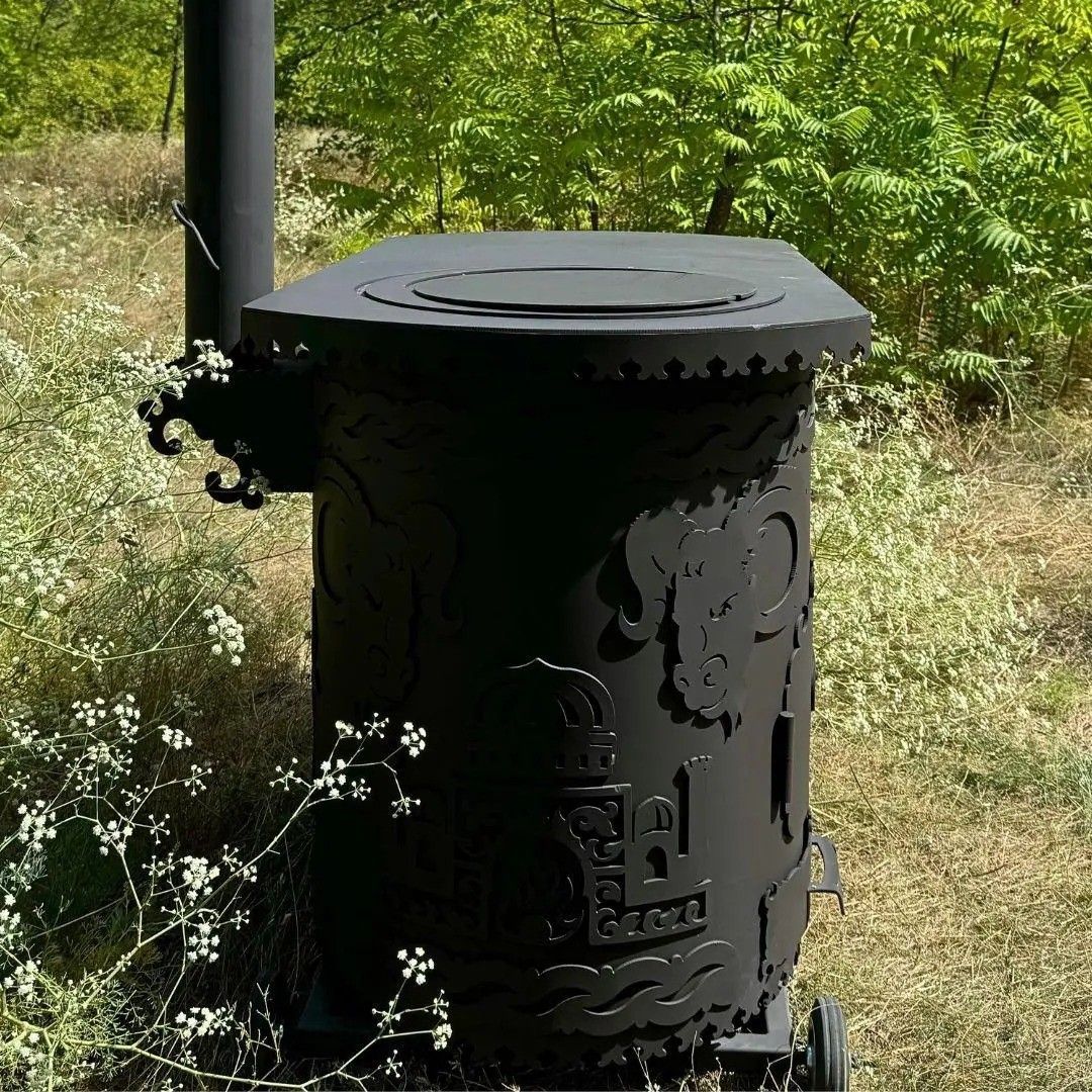Kochofen „Kolchida“ für 10–30 Liter Kessel. Robuste Ausführung mit Arbeitsfläche, Holzfach, Aschekasten und Zugregelung. Leicht beweglich dank Rädern.