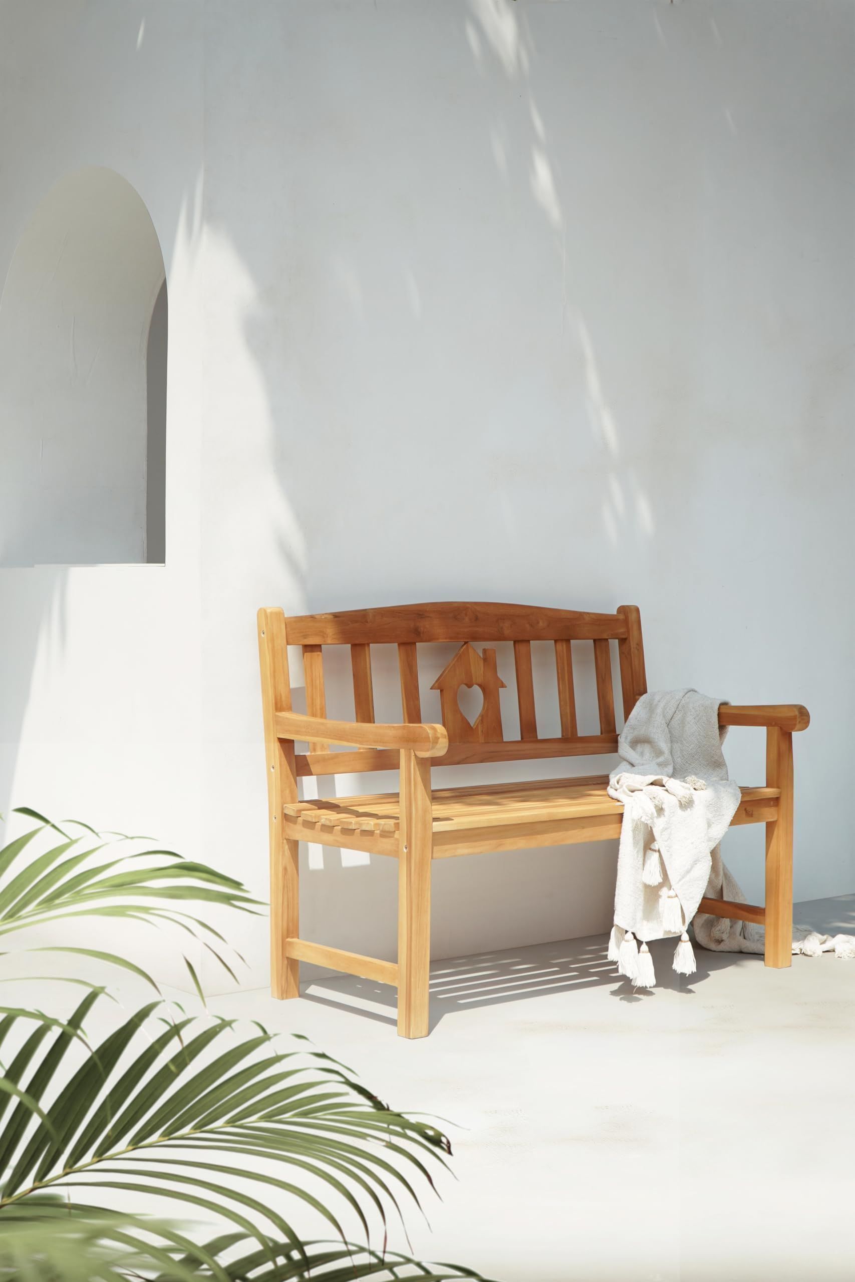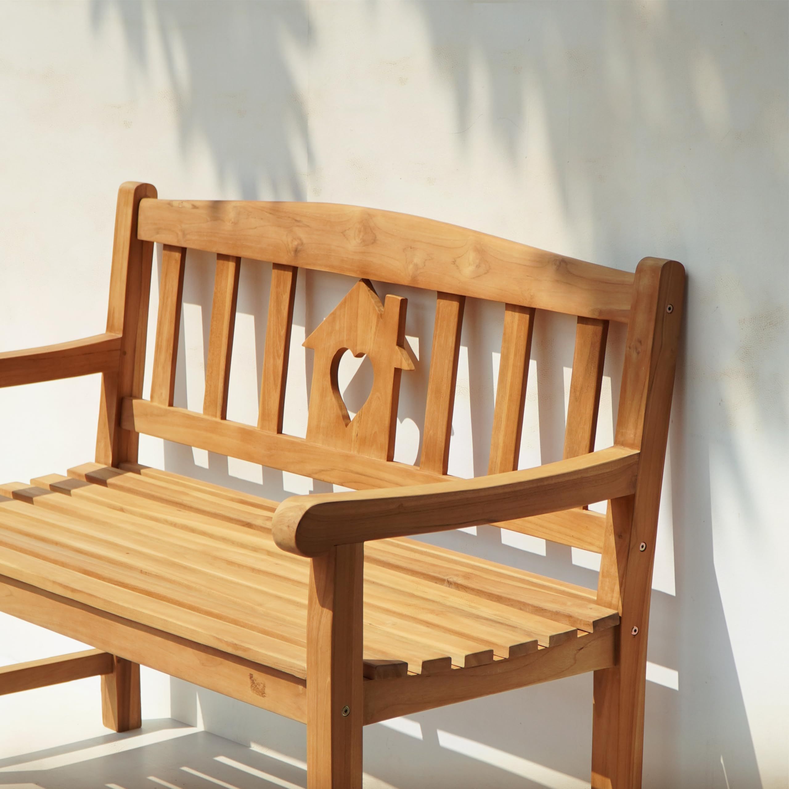 Gartenbank OLENA 2-Sitzer mit Haus und Herz 120cm Breit Teak Natur Terrassenbank