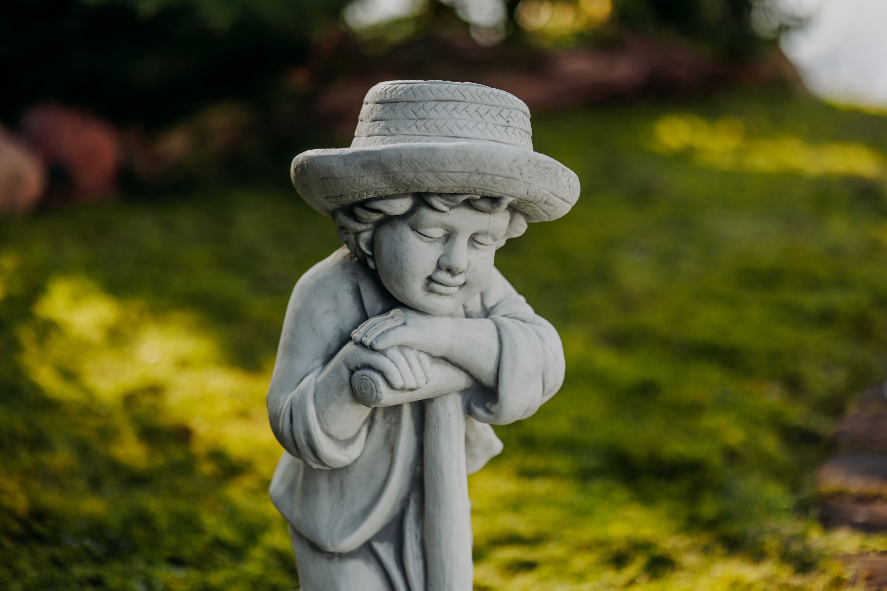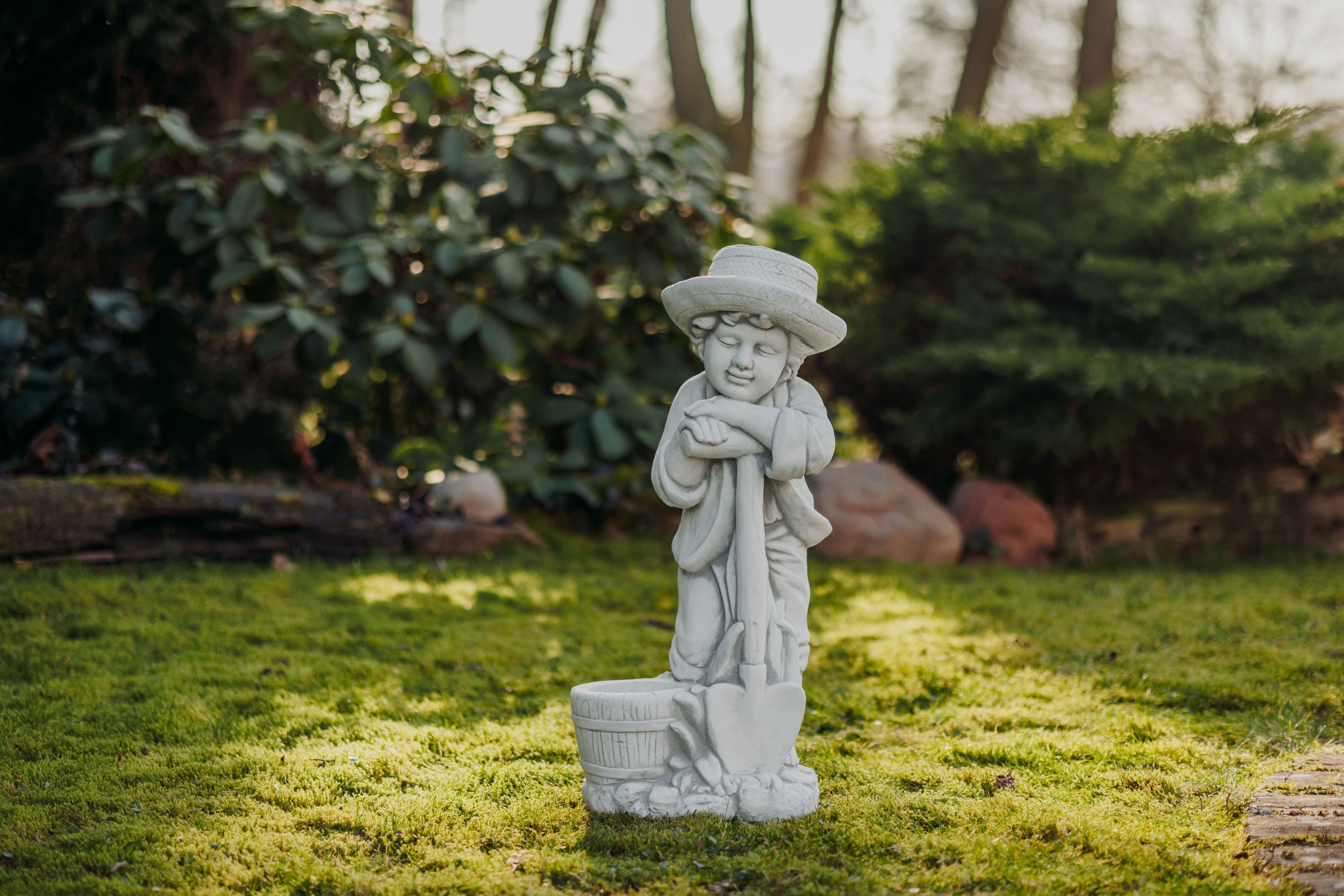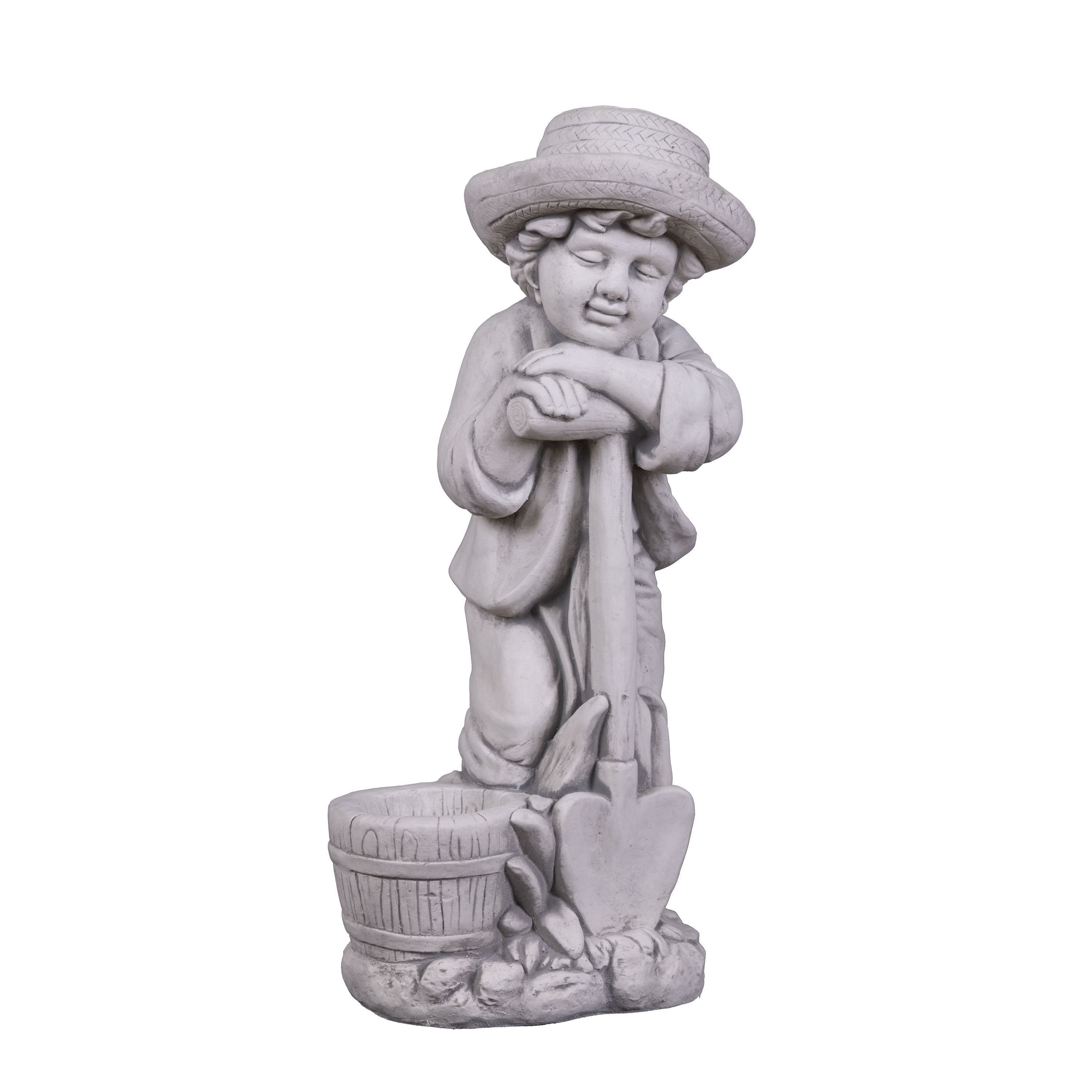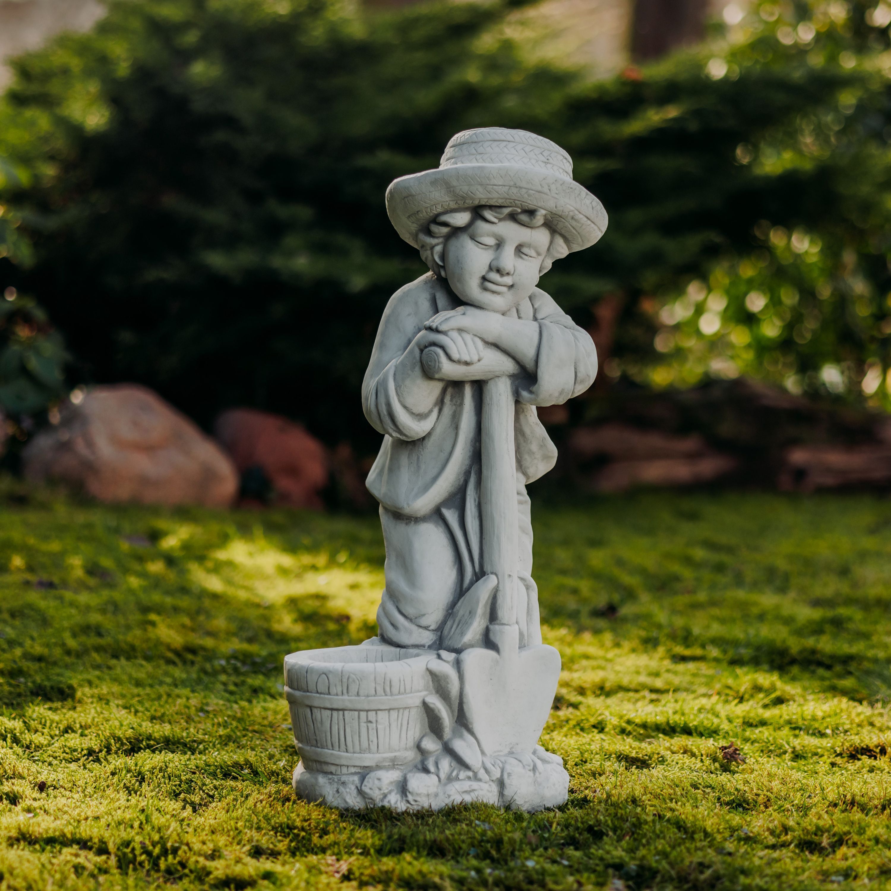 Gartenfigur Steinfigur Junge mit Spaten und Blumentopf, 68 cm Höhe, Grau, 36 kg