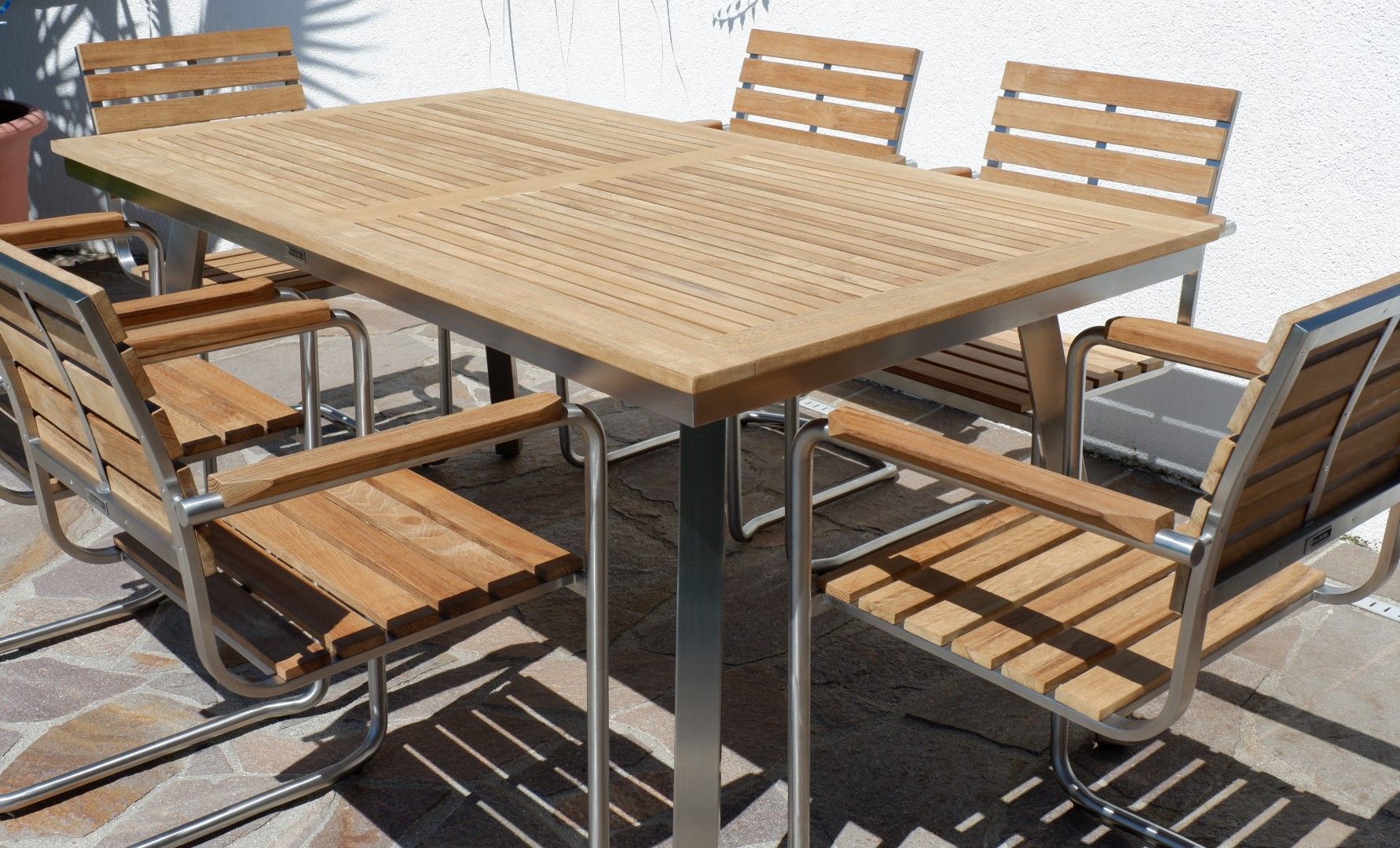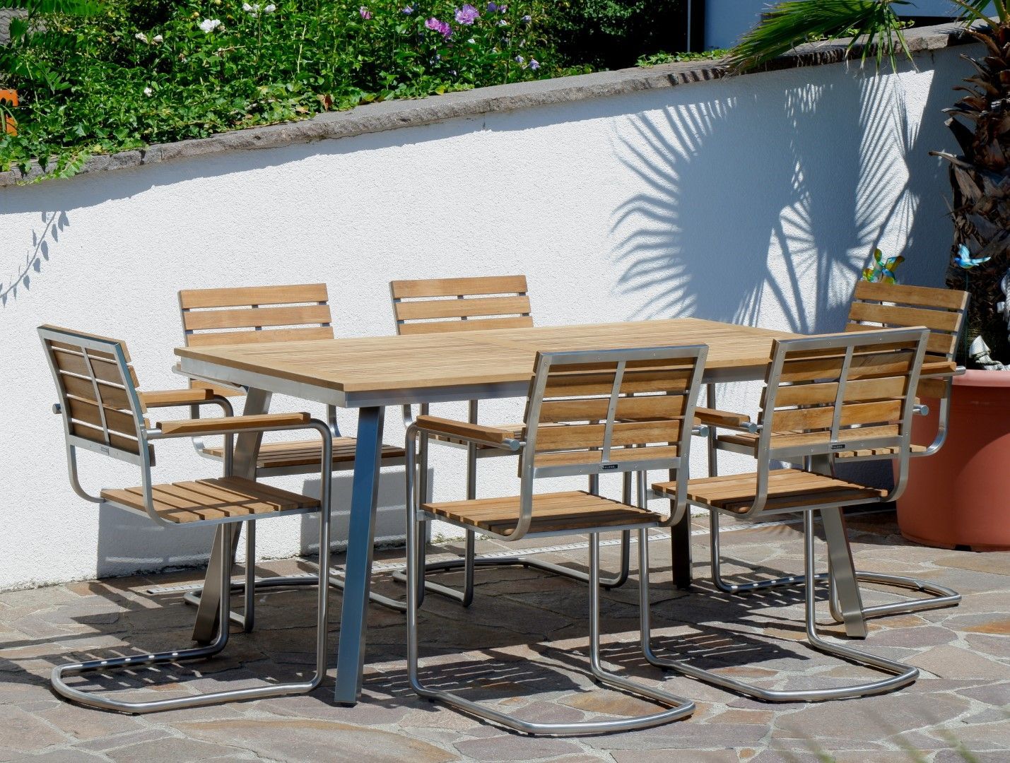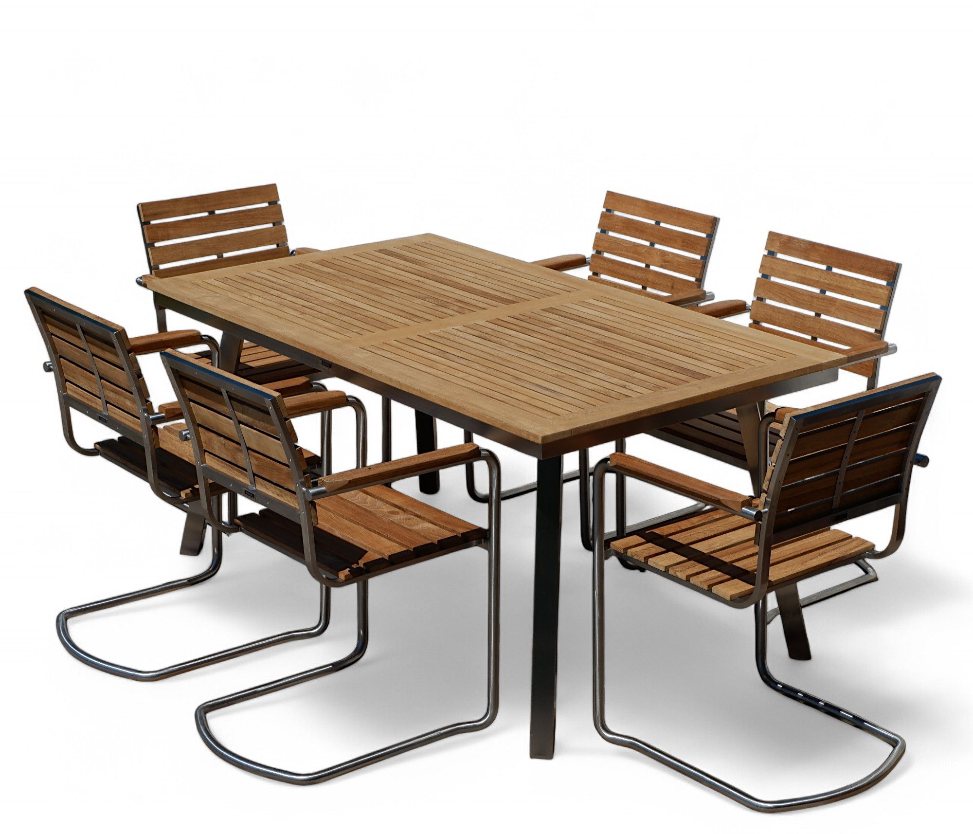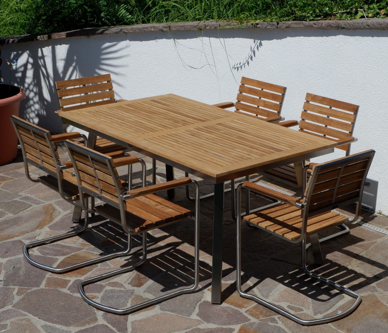 Gartengarnitur Edelstahl Teak Set: Tisch 160x90 cm + 6 Schwingsessel A-Grade