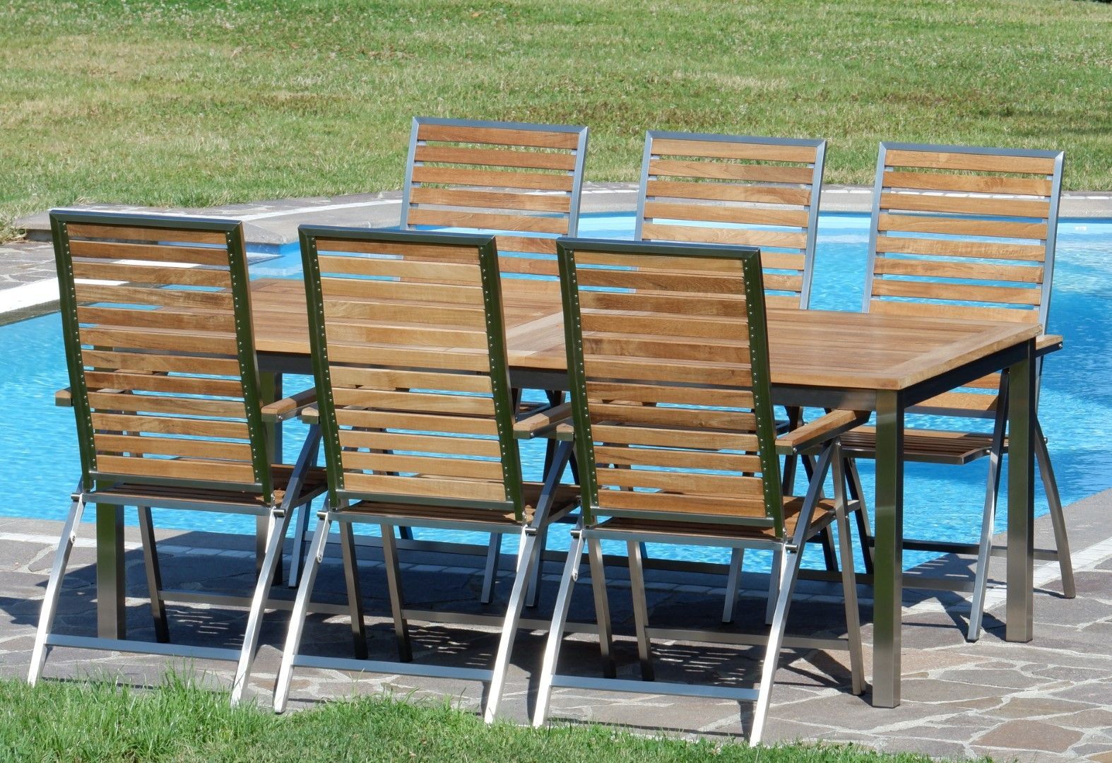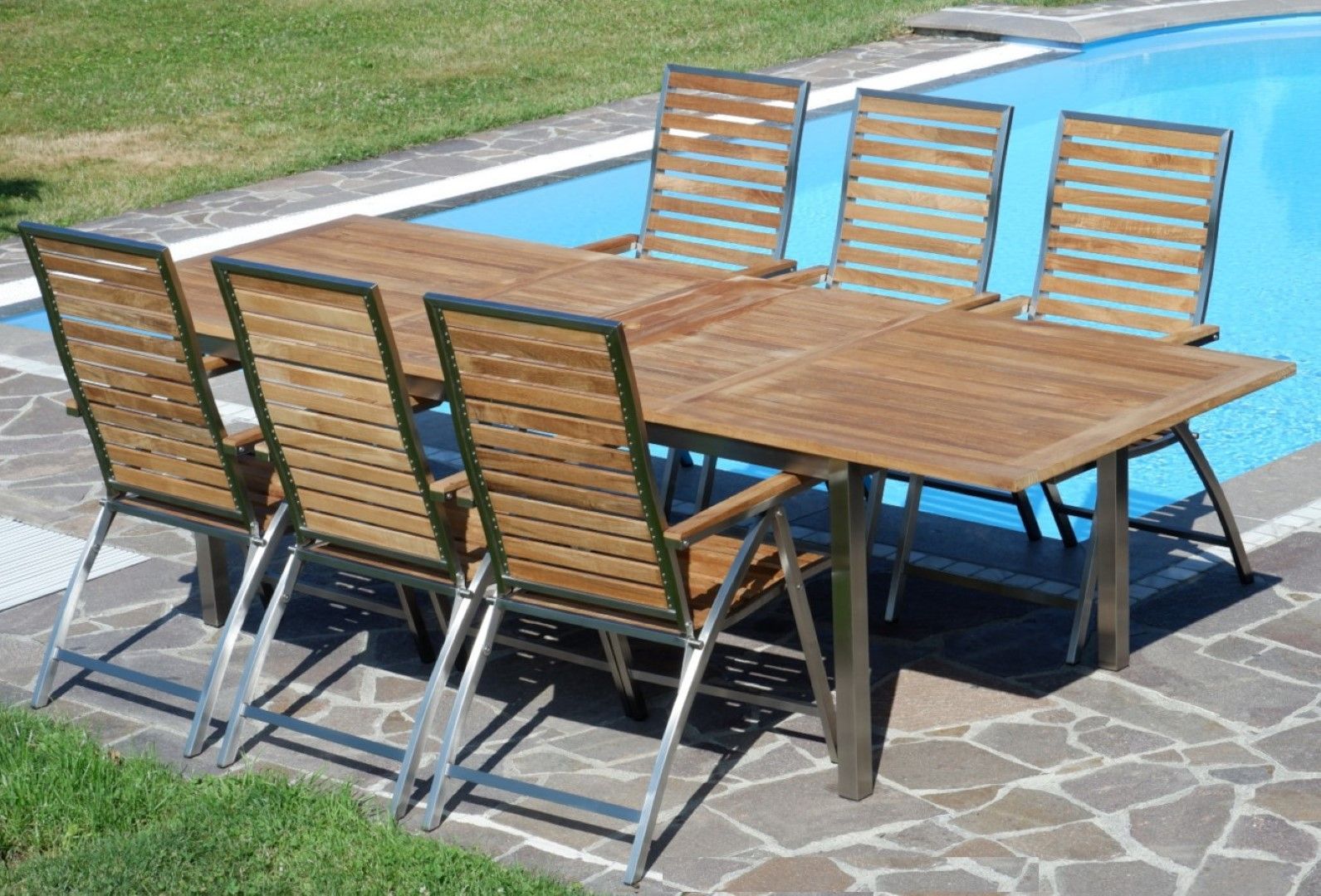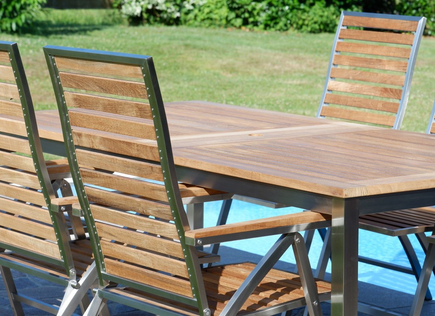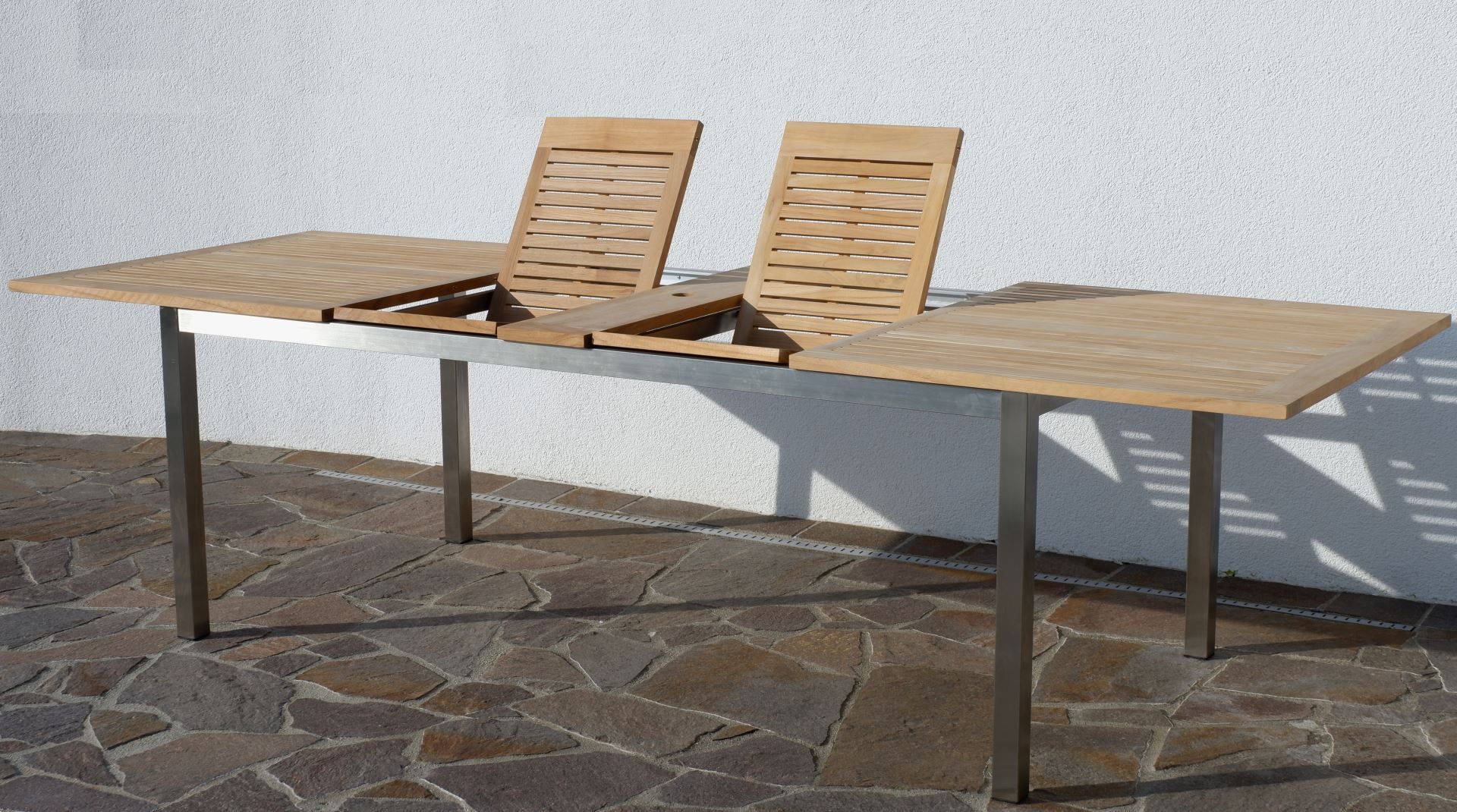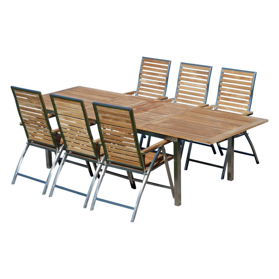 Gartengarnitur Edelstahl Teak Set Tisch 200/280 x100 cm + 6 Hochlehner Teak Holz