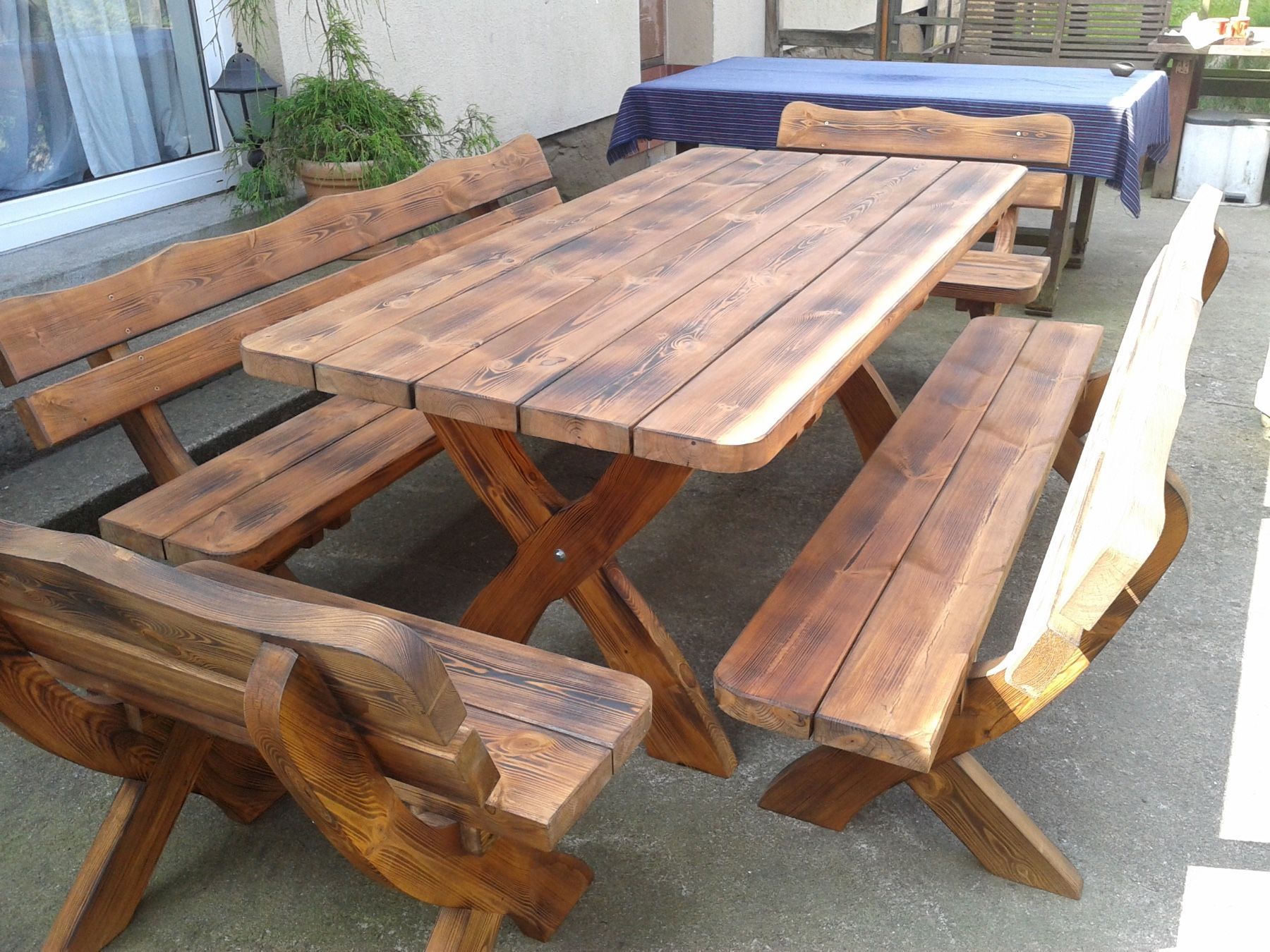 Gartenmöbel AR-OC Holzgartenmöbel, Tisch + 2 Bänke + 2 kleine Bänke. Farbe geflammt