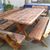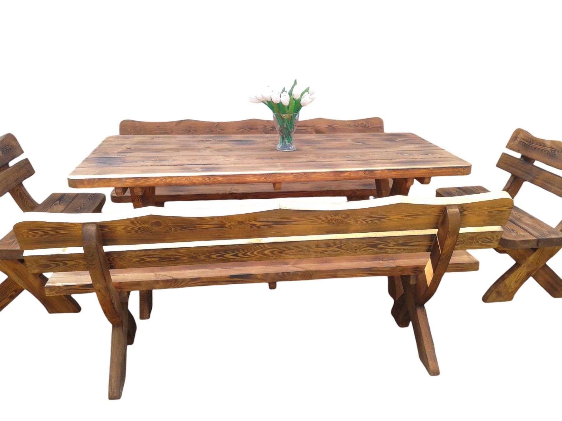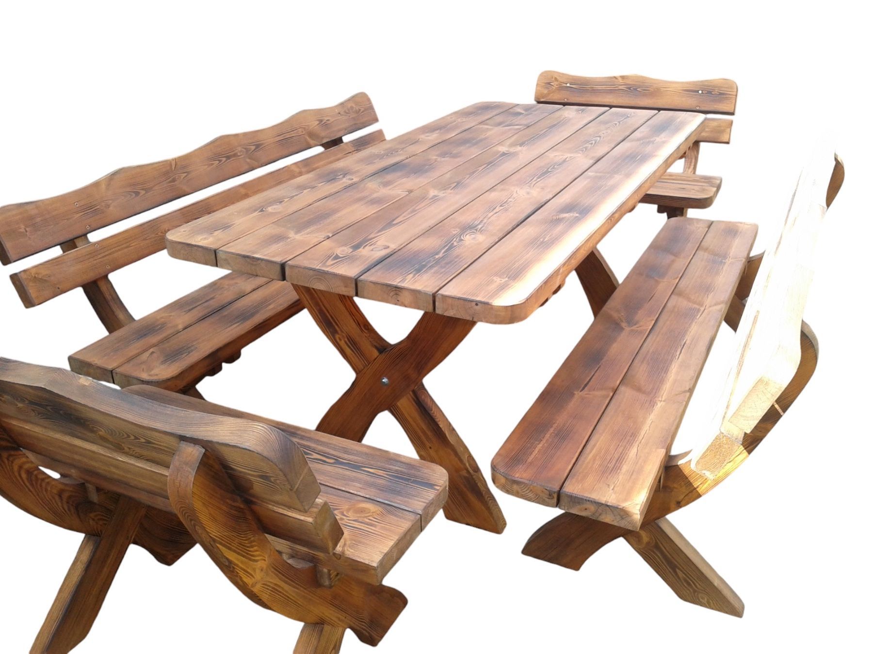Gartenmöbel OC Holzgartenmöbel, Tisch + 2 Bänke + 2 kleine Bänke. Farbe geflammt