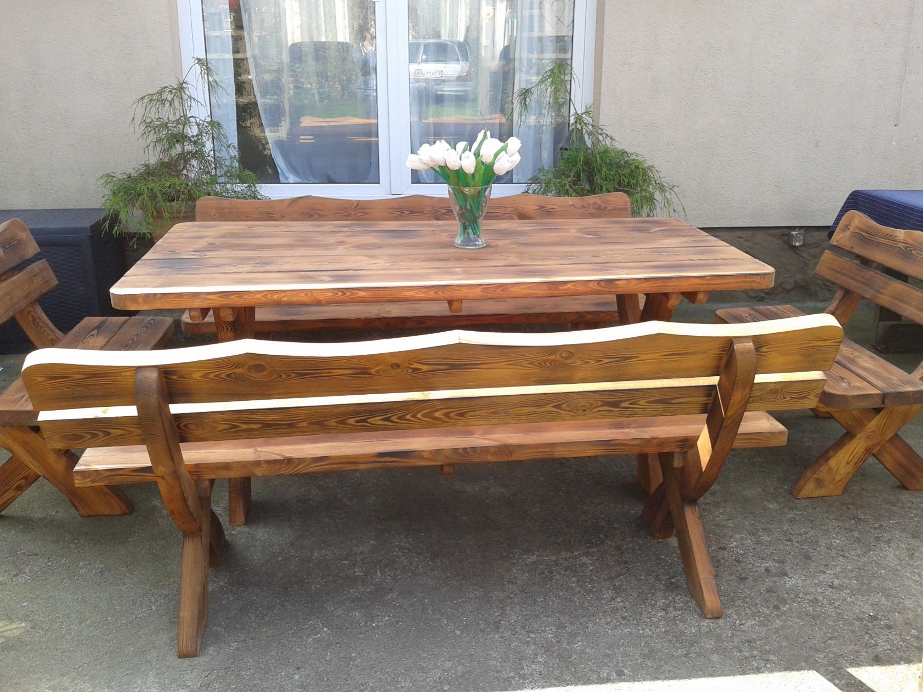 Gartenmöbel OJ, Holzgartenmöbel, Tisch + 2 Bänke + 2 kleine Bänke. Farbe geflammt