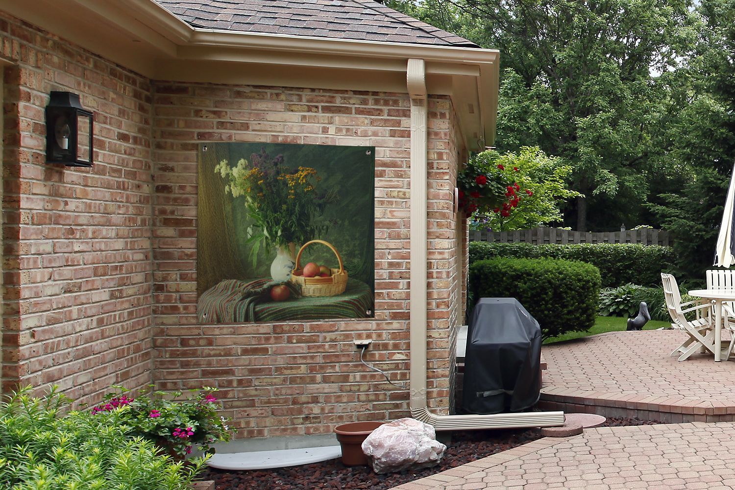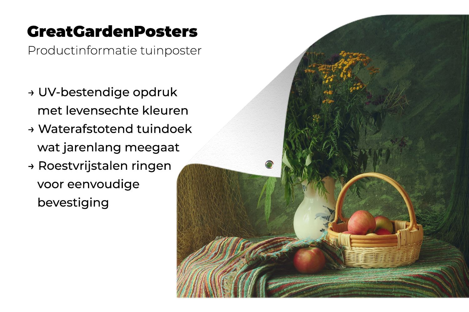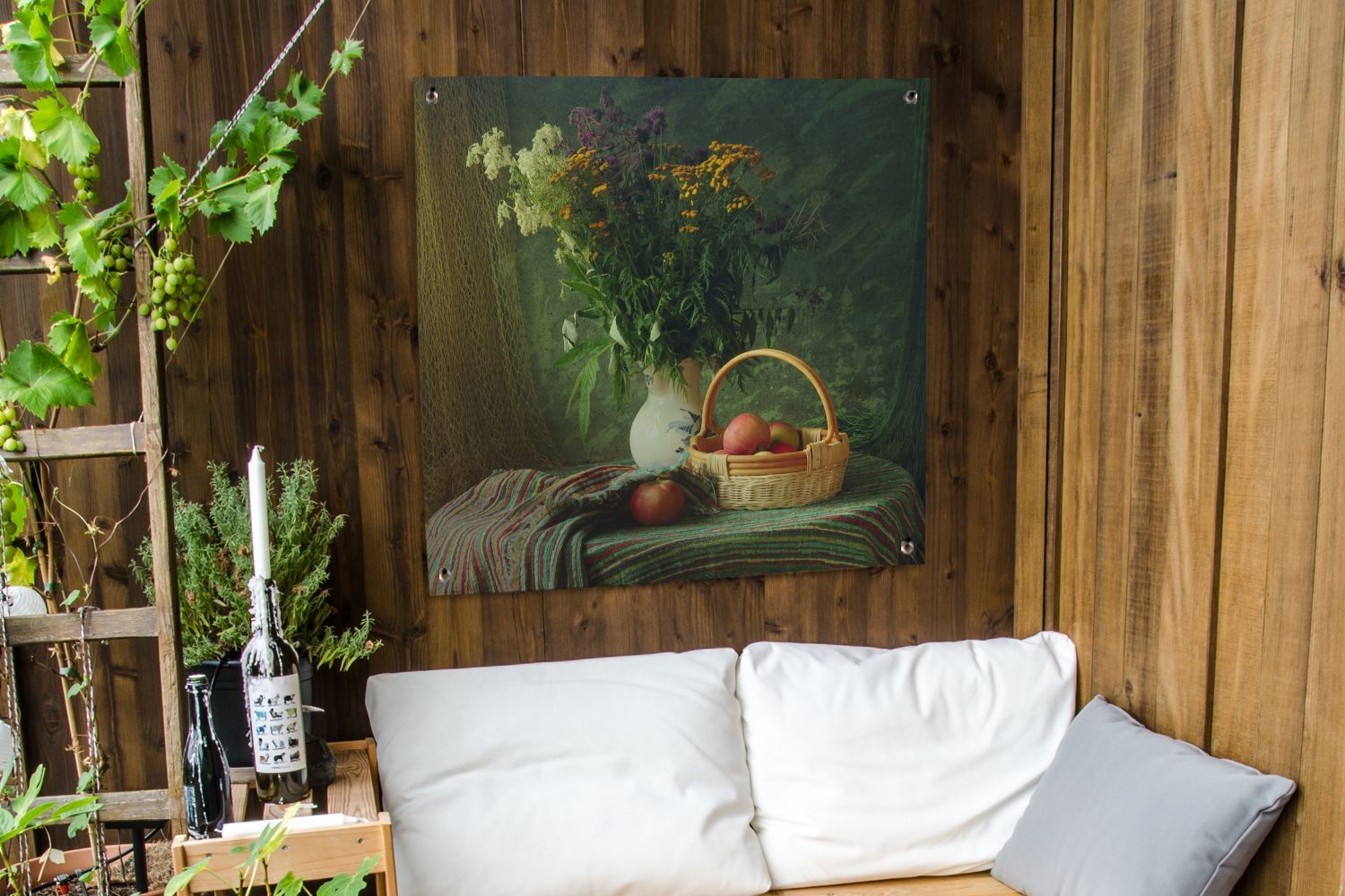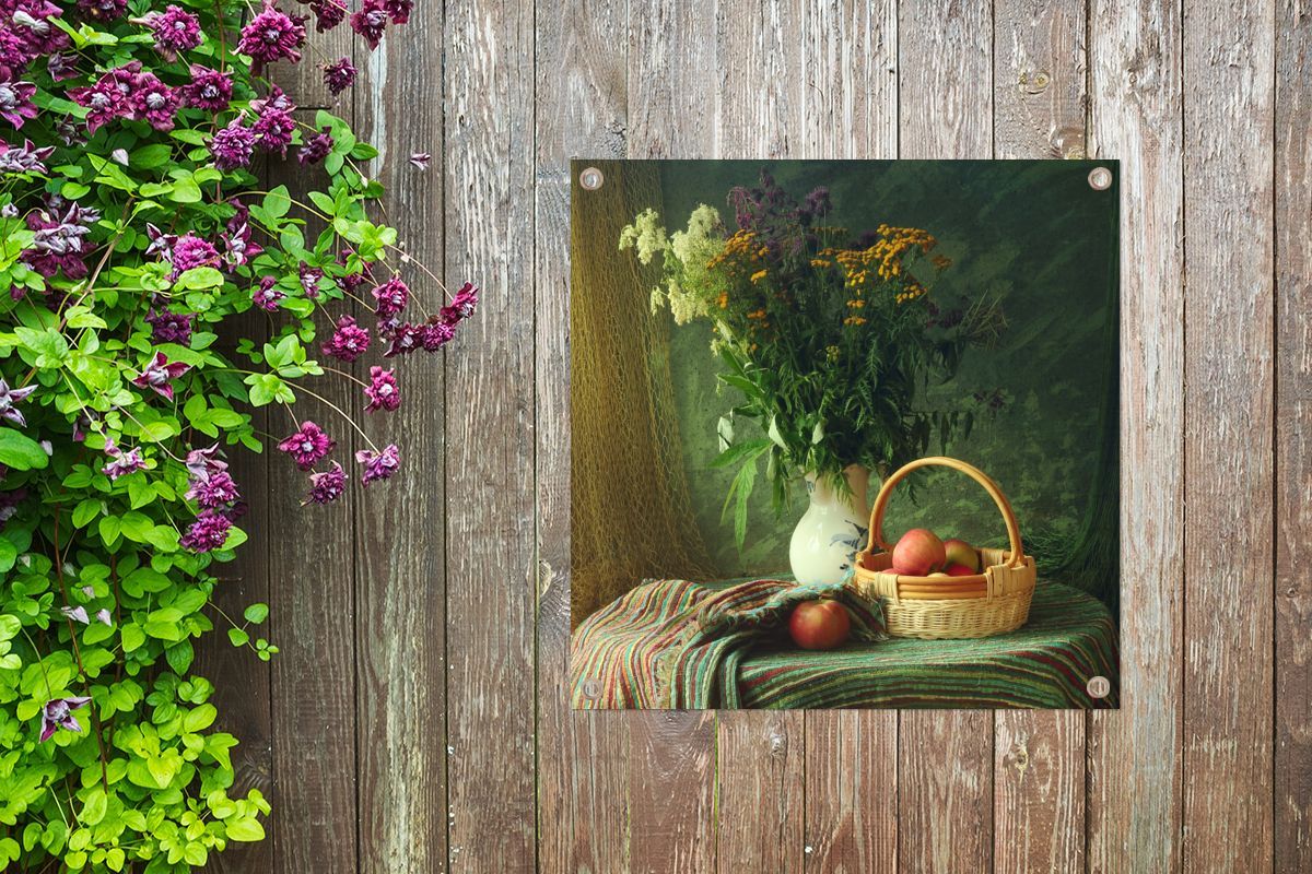 Gartenposter - 100x100 cm - Stilleben - Blumen - Apfel - Korb - Tisch - Malerei