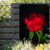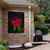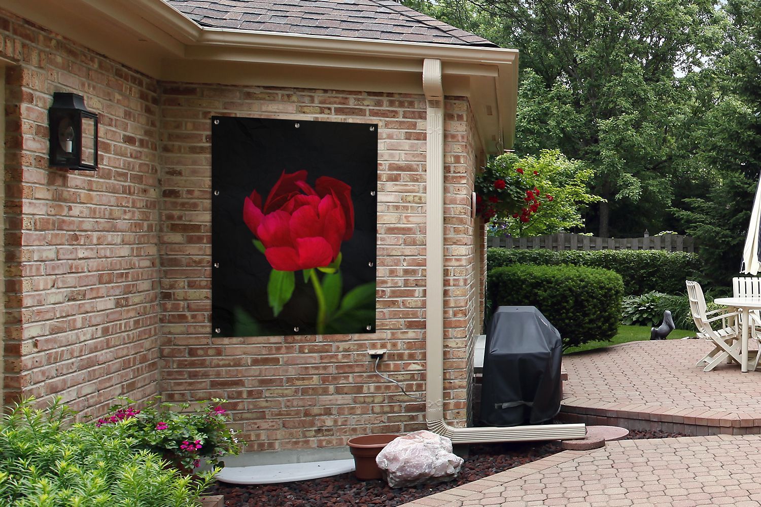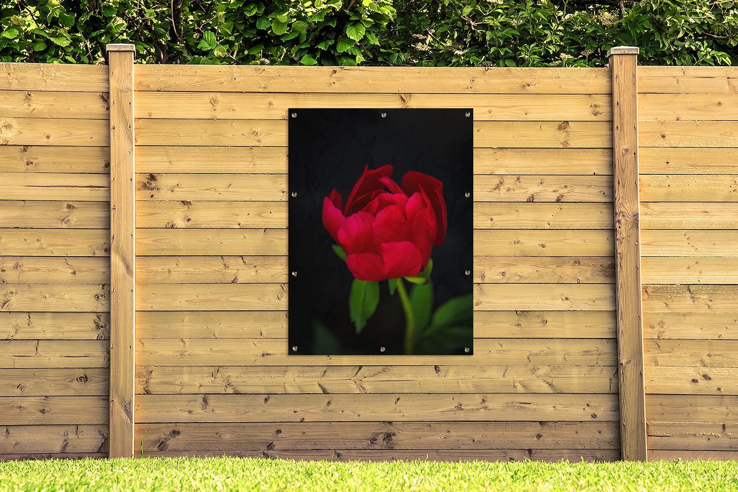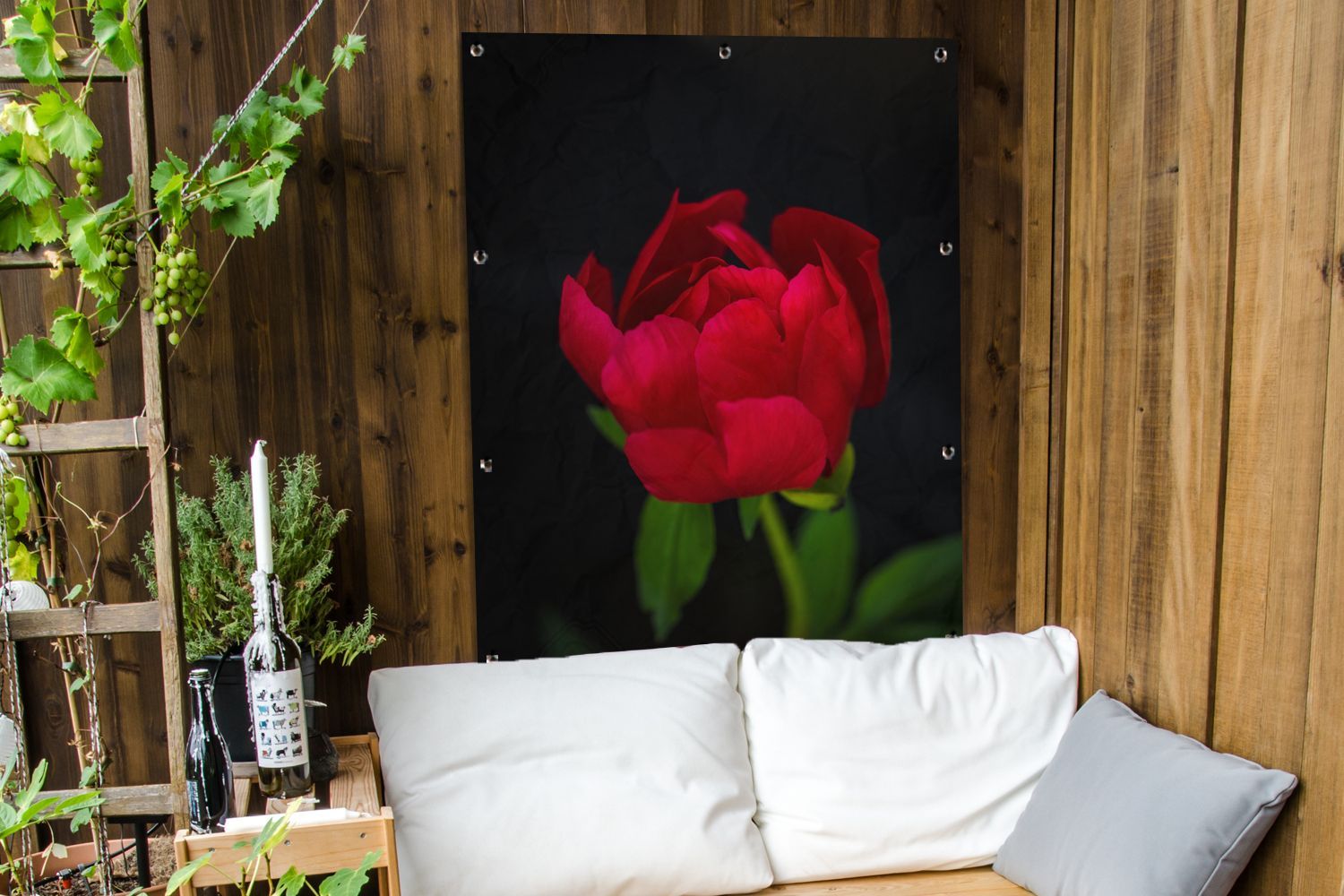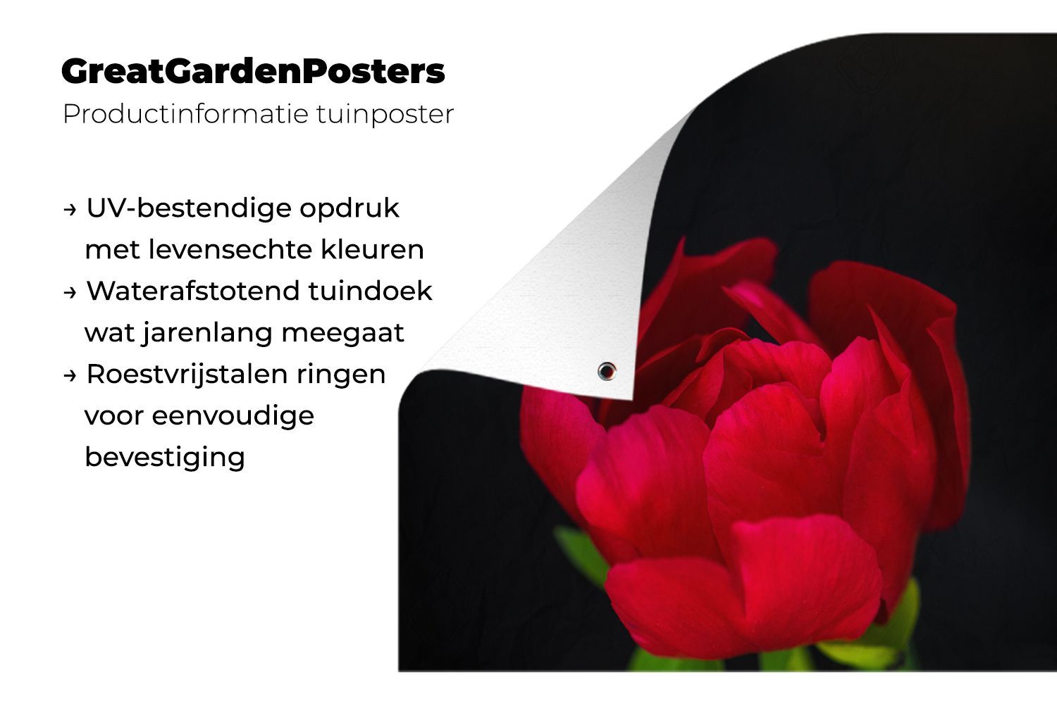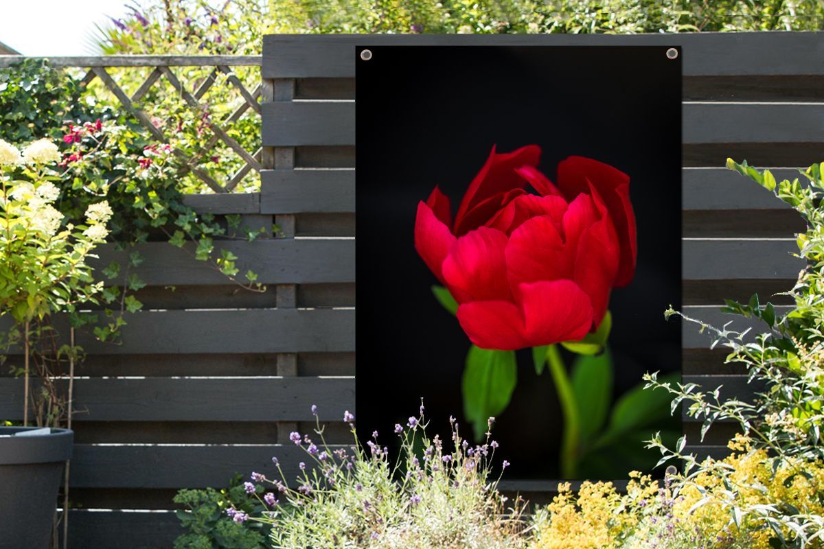 Gartenposter - 90x120 cm - Eine Knospe einer roten Pfingstrose mit schwarzem Hintergr