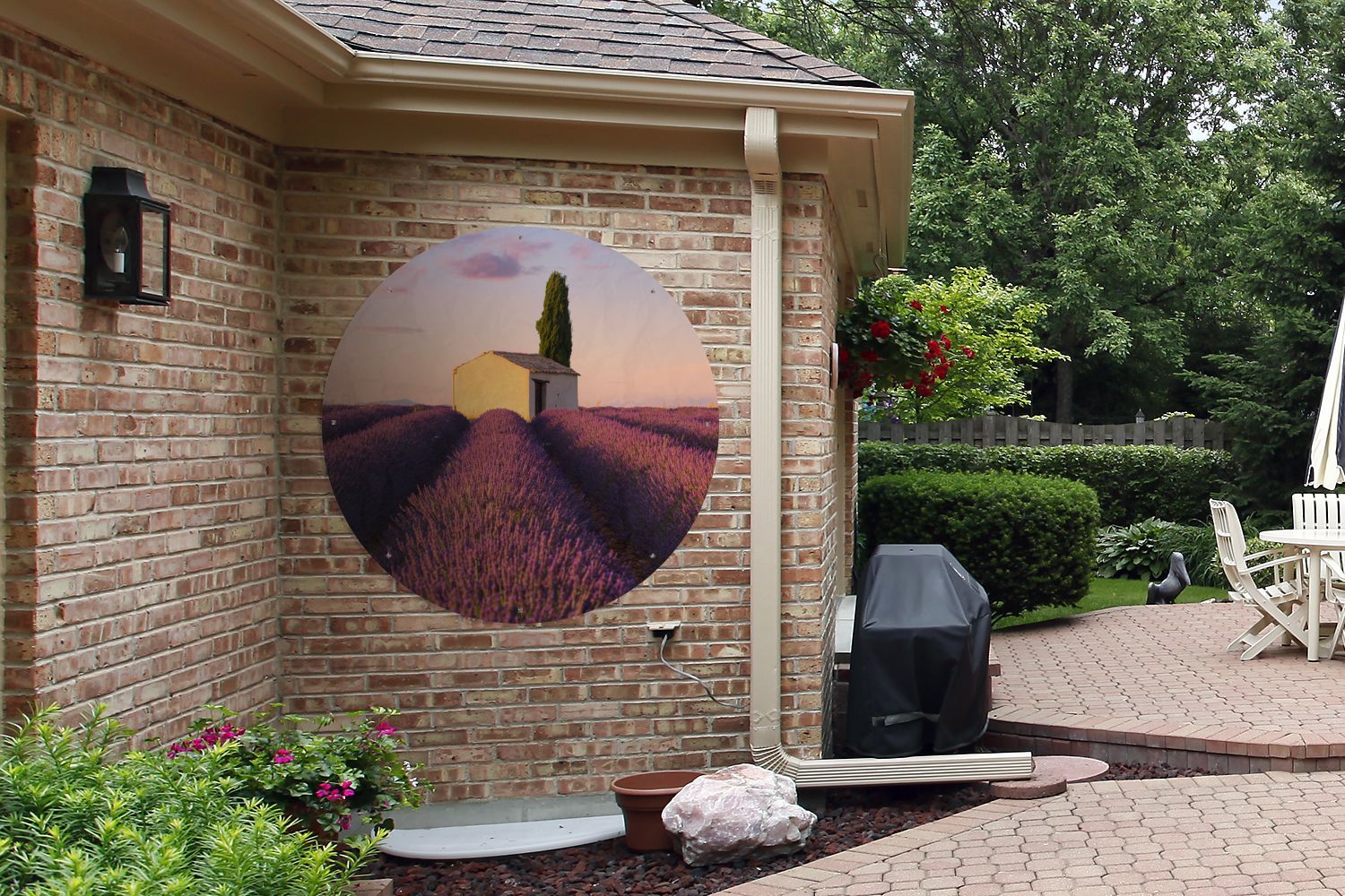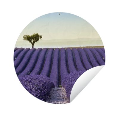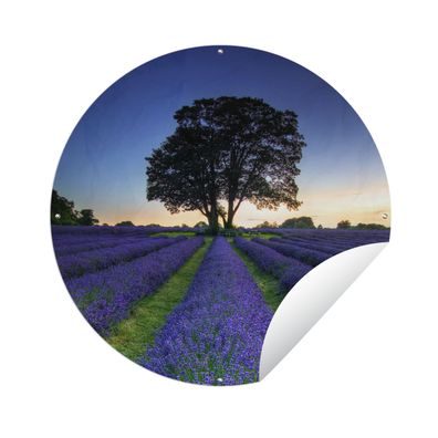 Gartenposter Rund - Die perfekten Reihen von Lavendelfeldern mit zwei Bäumen am Horiz