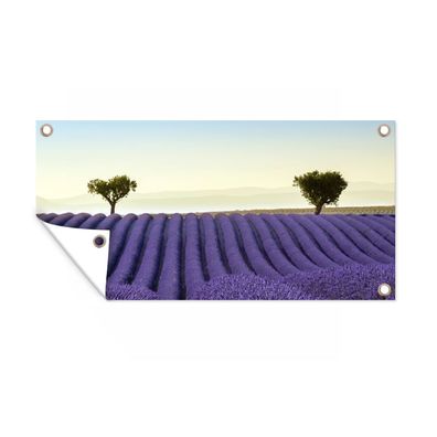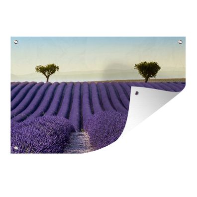 Gartenposter - Die perfekten Reihen von Lavendelfeldern mit zwei Bäumen am Horizont -