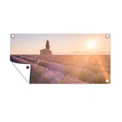Gartenposter - Die Sonnenstrahlen fallen auf die Reihen eines Lavendelfeldes - 80x40