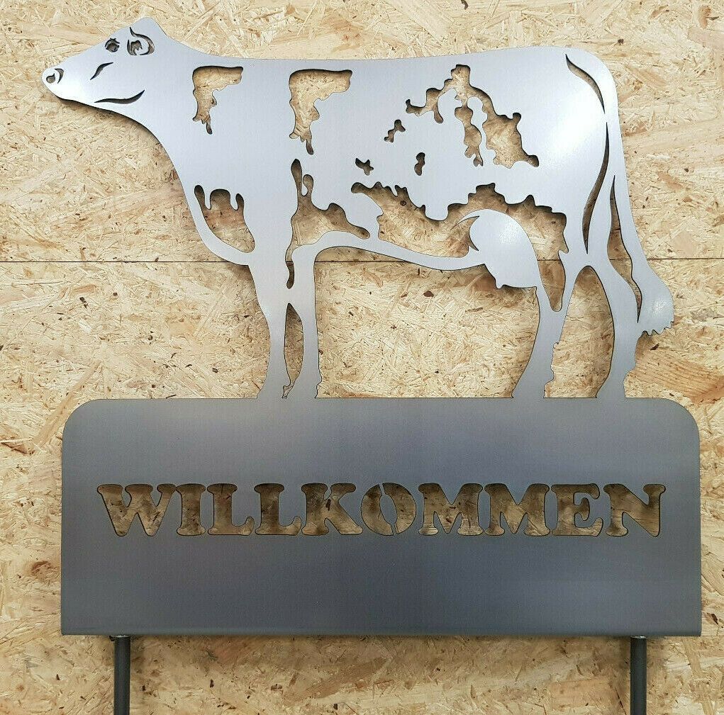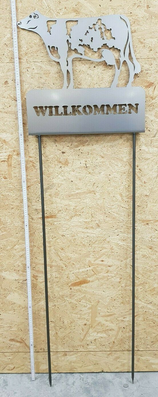 Hier könnt Ihr unseren stabilen Gartenstecker Kuh mit Schriftzug Willkommen erwerben. Der Gartenstecker hat eine Höhe von ca. 165 cm, eine Breite von 50 cm und besteht aus 2mm dickem Stahlblech. Zwei angespitzte Rundstäbe (12 mm Durchmesser) geben ihm einen guten Halt im Boden. Je nachdem wie weit d