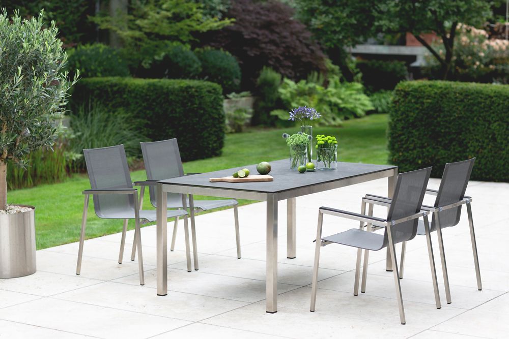 Gartenstuhl Urbano 56x65 Stoff Silbergrau Armlehne Aluauflage Gestell Edelstahl