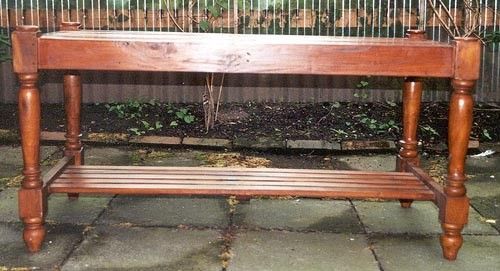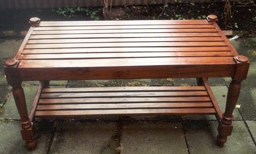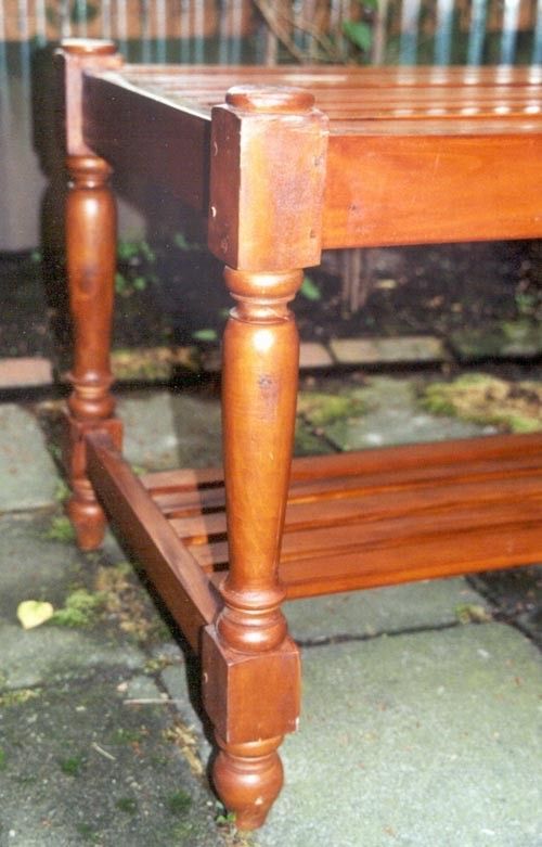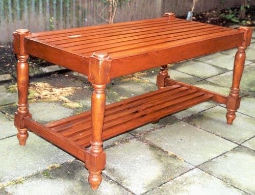Lattenrostartig angelegt ist die Tischplatte, sowie die zusätzliche Ablagefläche im unteren Bereich, von diesem rechteckigem Tisch. Er wurde aus Mahagoni - Holz gefertigt und ist in einem hellen Nussbaumton. Gesamthöhe ca. 60 cm Gesamtbreite ca. 120 cm Gesamttiefe ca. 60 cm Höhe bis untere Ablageflä