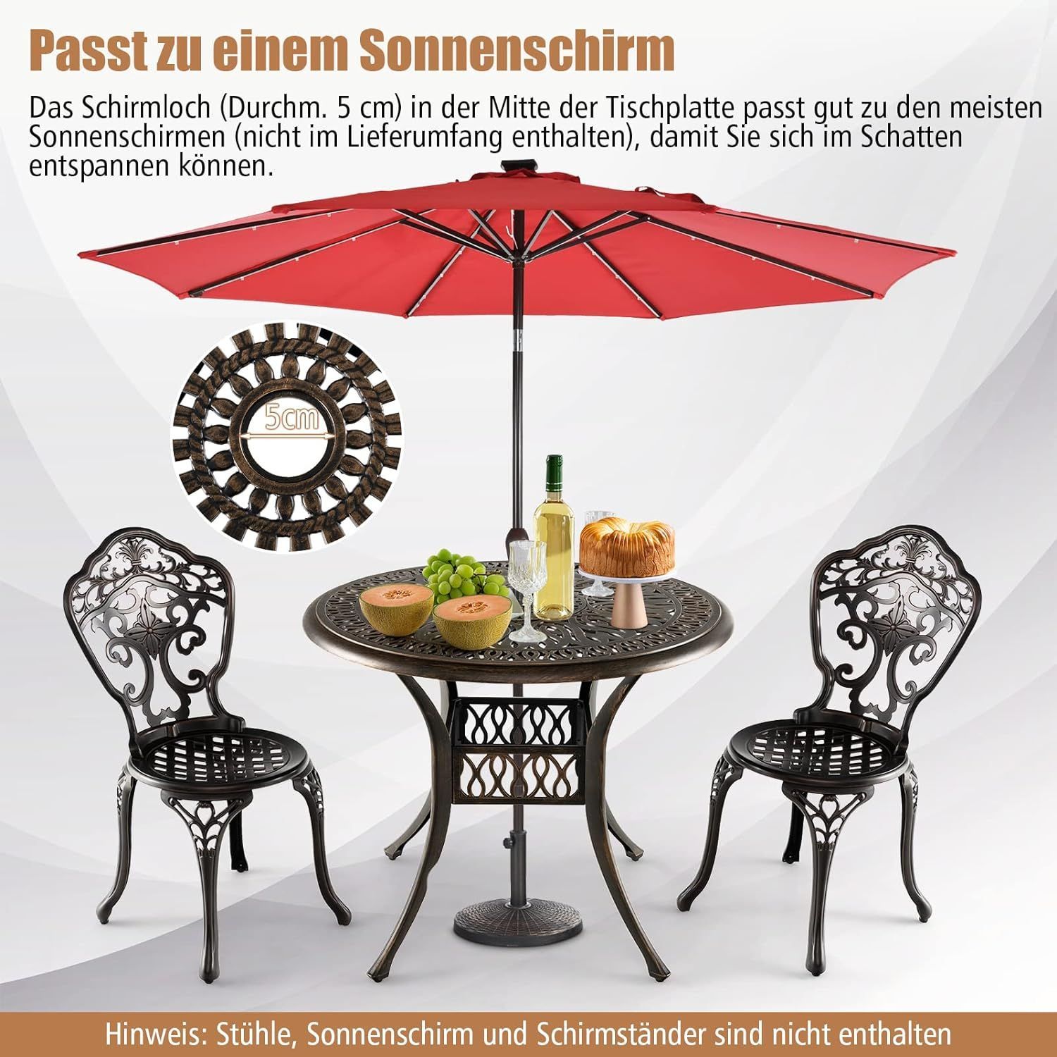 Gartentisch mit Schirmloch, runder Balkontisch aus Aluminiumguss, 90 x 90 x 74 cm
