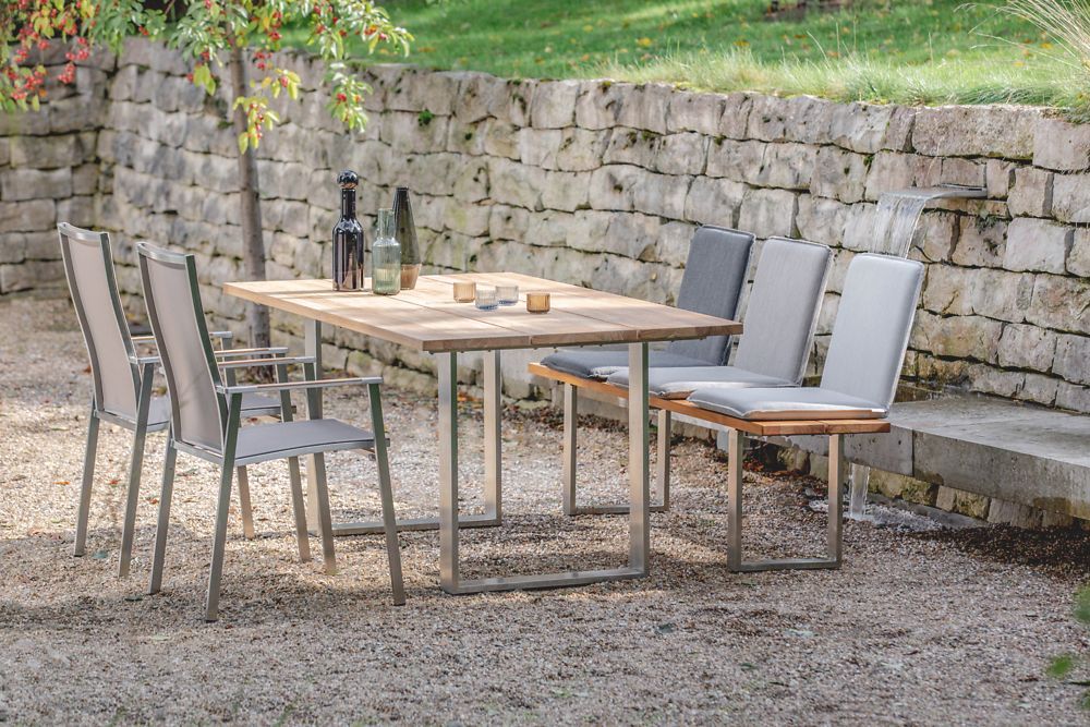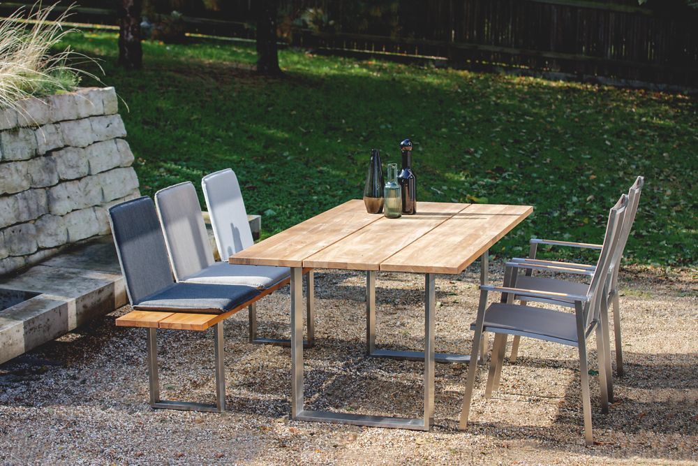 Gartentisch Noha 180x95 Tischplatte Teakholz Profilkufe Edelstahl gebürstet
