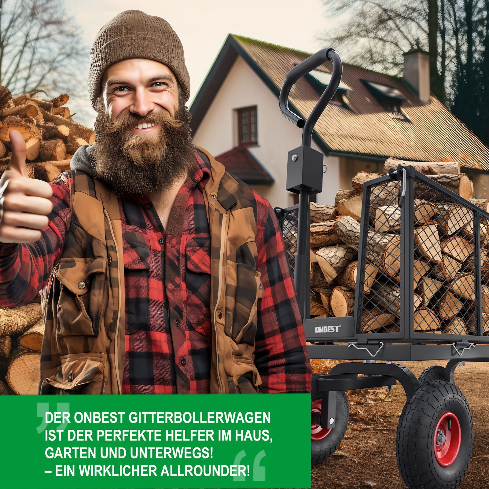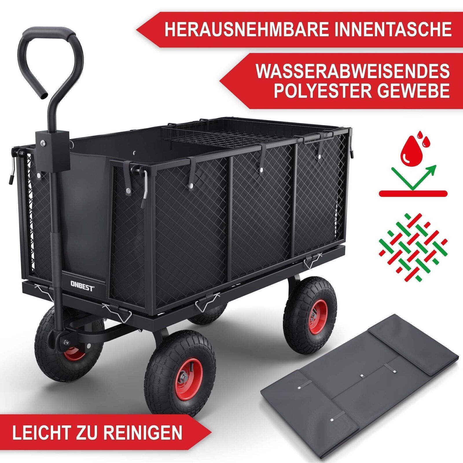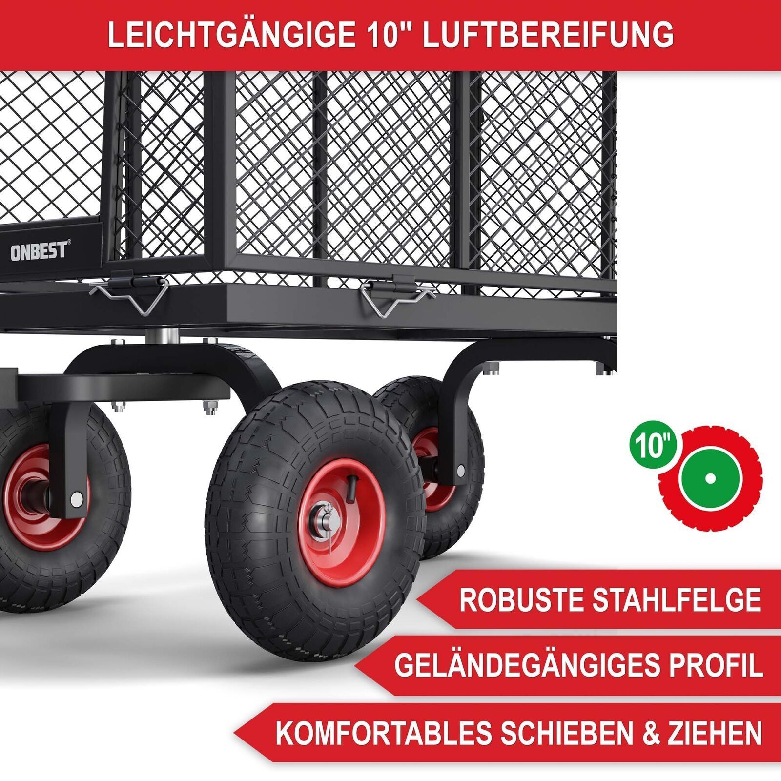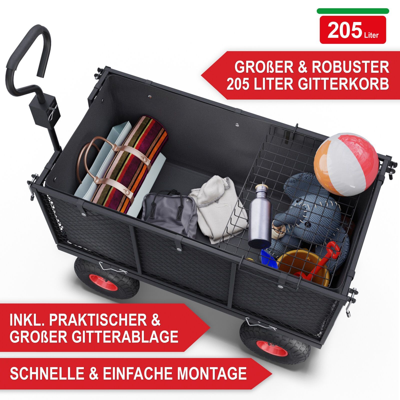 90 & 60 & 45 & 25 cm Luftrad - Gitterbollerwagen Der Gitterbollerwagen mit seinem 205 Liter großen Gitterkorb aus robustem Stahl ist die ideale Lösung für schwere Transportaufgaben. Die Gitterwände können für einfaches Be- und Entladen heruntergeklappt oder komplett abgenommen werden. Mit einer maxi