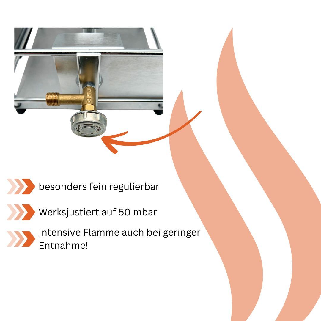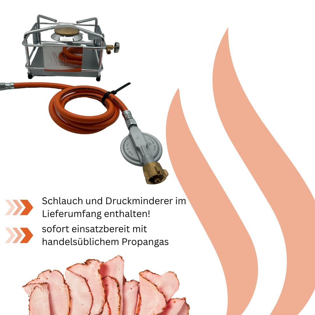 Der leistungsstarke Gaskocher mit 6,0 kW ist ideal für den Einsatz in Räucheröfen bis zu einer Größe ab 110 cm. Mit einer Abmessung von 300 x 300 mm ist er besonders gut für große Räucheröfen geeignet. Der Gaskocher ist sofort einsatzbereit und bietet ein