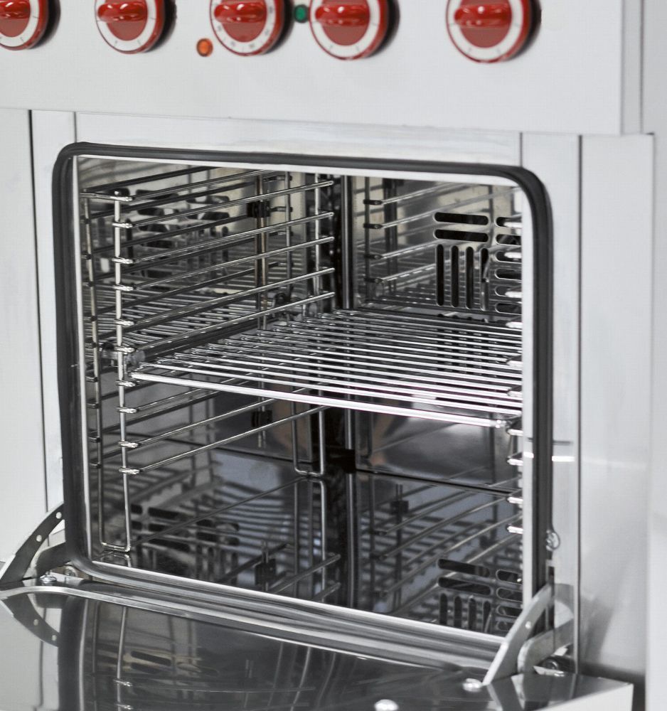 Gasherd 4 Brenner (2x 3,3 kW und 2x 3,6 kW). Elektro-Umluftofen GN 2/3 (3 kW), 370x340xh325 mm). Gestanzte Oberfläche. Hergestellt aus Edelstahl AISI 304, verstellbare Füße aus Edelstahl.