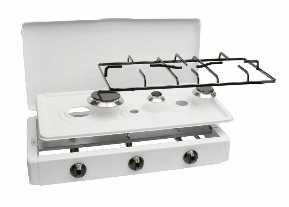 Hochwertiger Haushaltskocher mit 3 Kochstellen und Zündsicherung. Für den Innenraum zugelassen ! Vorteile: - für geschlossene Räume zugelassen - zündgesichert - emailliertes Gehäuse - abnehmbare Überlaufmulde zur leichten Reinigung - Gusseisentopfträger + emailliert - Gusseisenbrennerdeckel + emaill