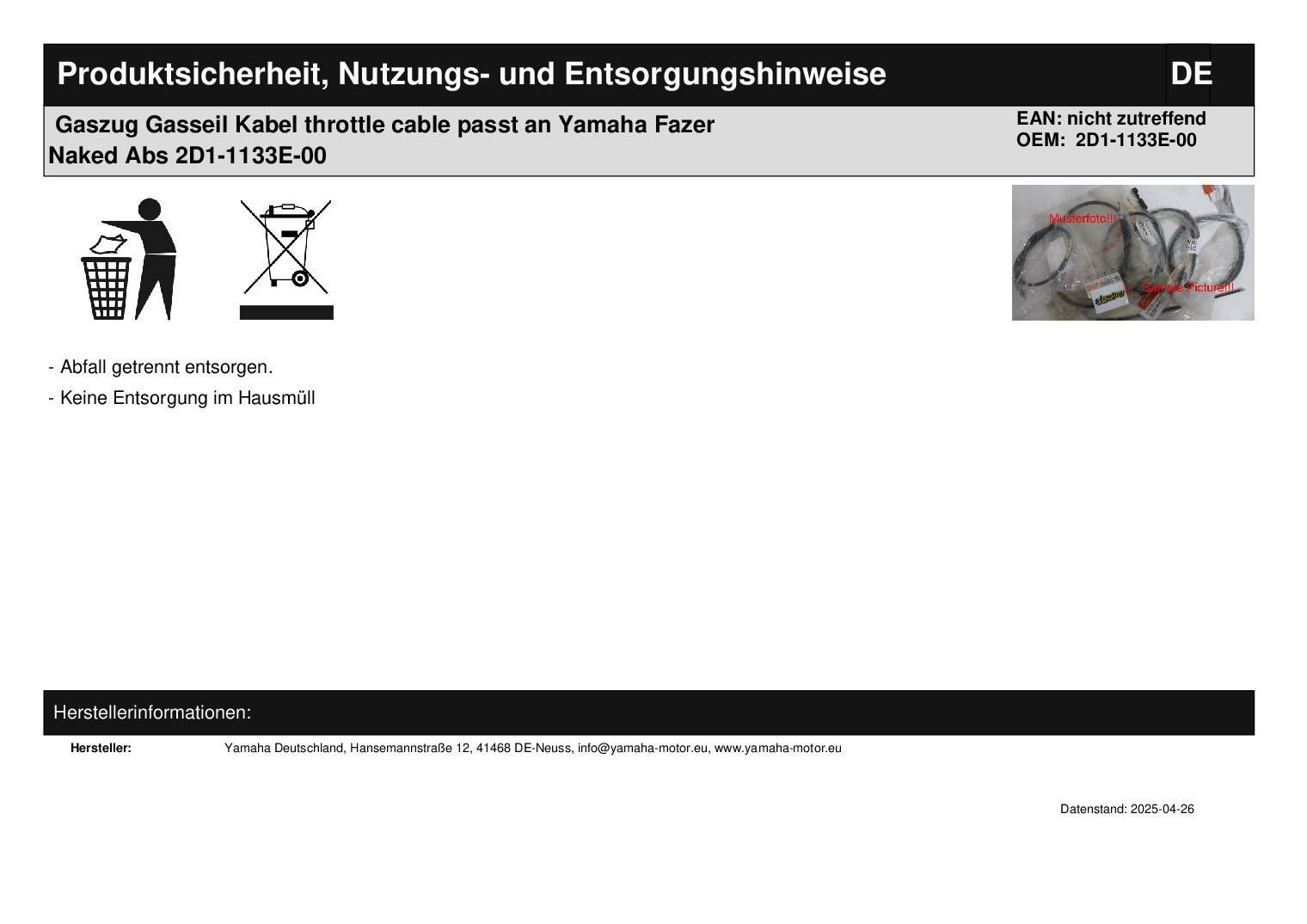 Gaszug Gasseil Kabel throttle cable passt an Yamaha Fazer Naked Abs 2D1-1133E-00