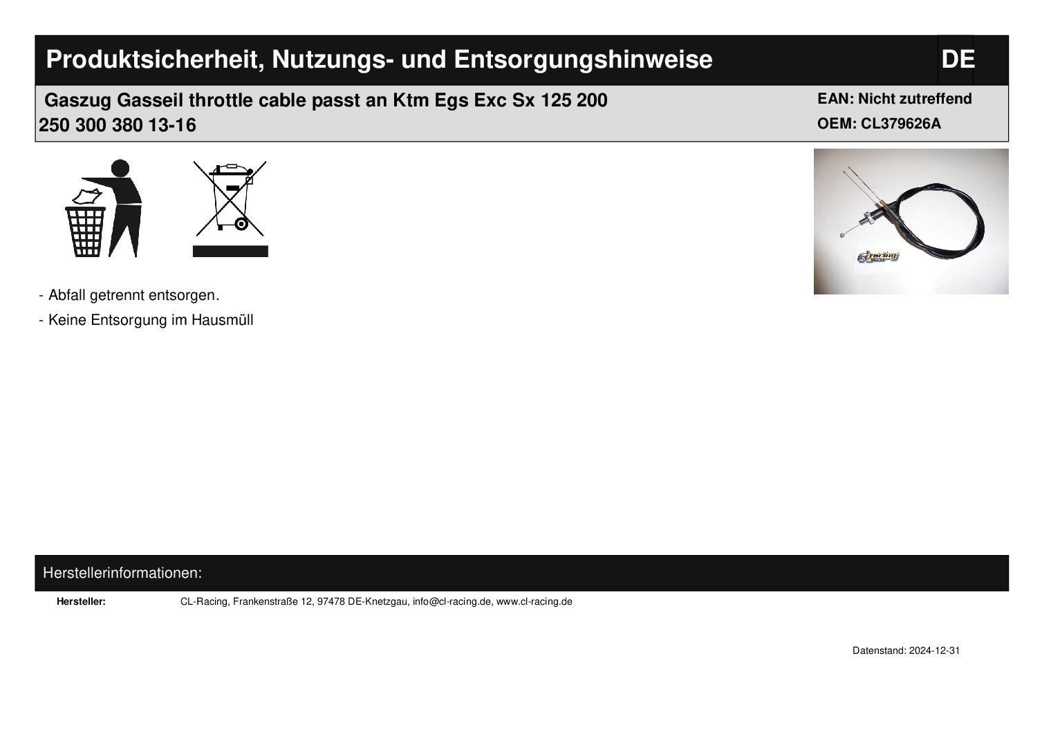 Gaszug Gasseil throttle cable passt an Ktm Egs Exc Sx 125 200 250 300 380 13-16
