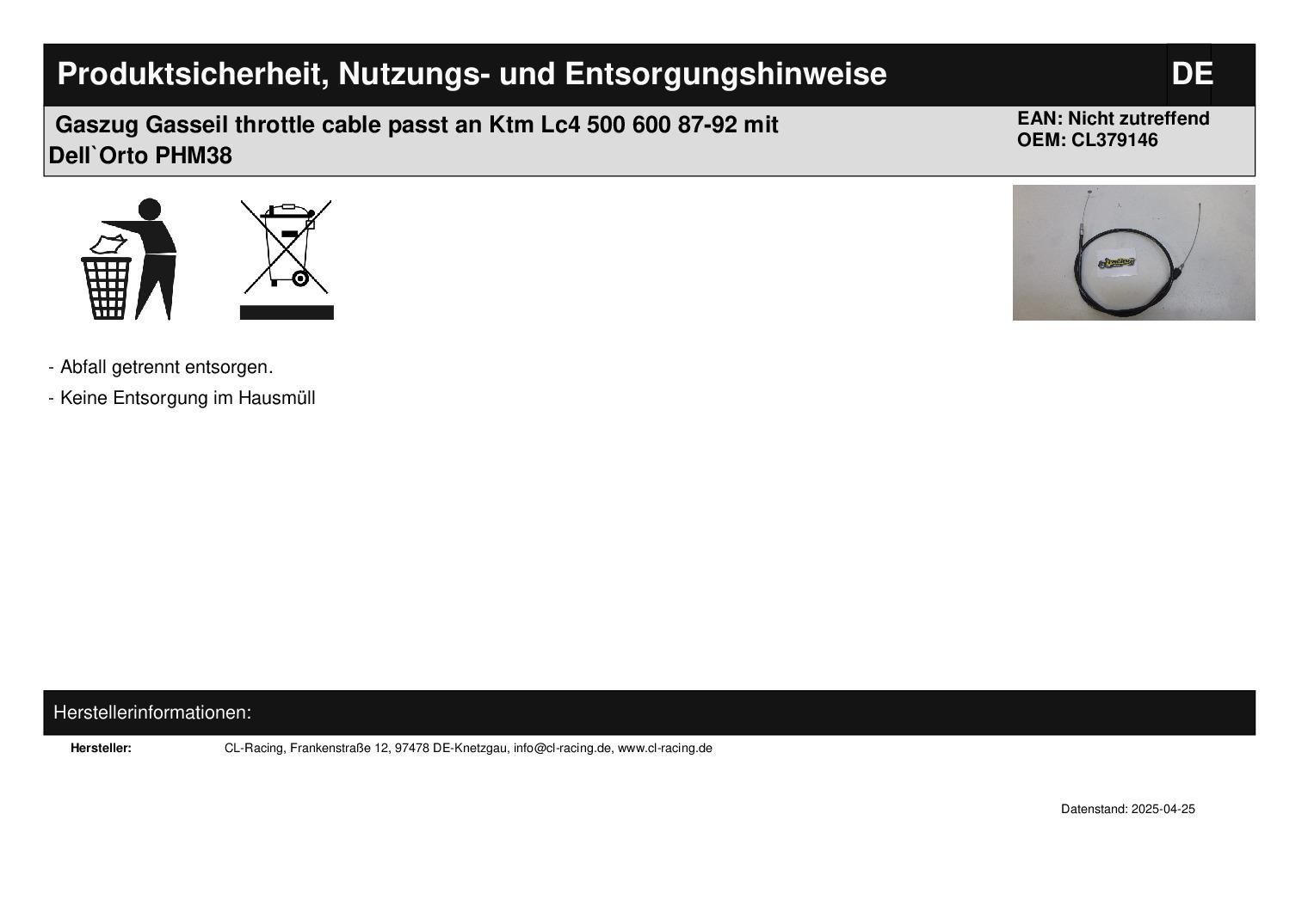 Gaszug Gasseil throttle cable passt an Ktm Lc4 500 600 87-92 mit Dell`Orto PHM38