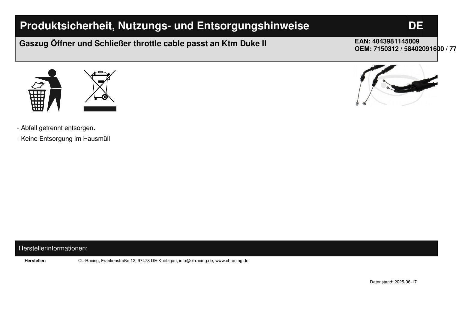 Gaszug Öffner und Schließer throttle cable passt an Ktm Duke II 584.02.091.600