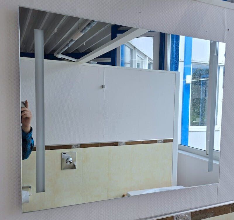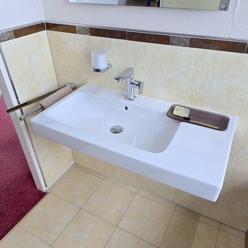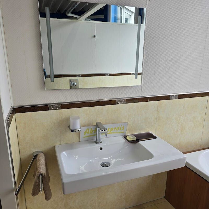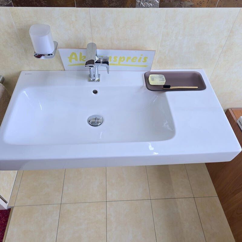 Abverkauf aus Badausstellung, geprüft und ohne Mängel Bestehend aus: Geberit iCon Waschtisch mit Ablagefläche und Dekoschale, Abmessungen BxHxT = 89x16x48,5cm, weiß, Asymmetrisch, unterbaufähig, aus Sanitärkeramik, mit Hahnlochbohrung, mit Überlaufloch, Art-Nr.: 124190000 Spiegel Exklusiv MONACO Mod