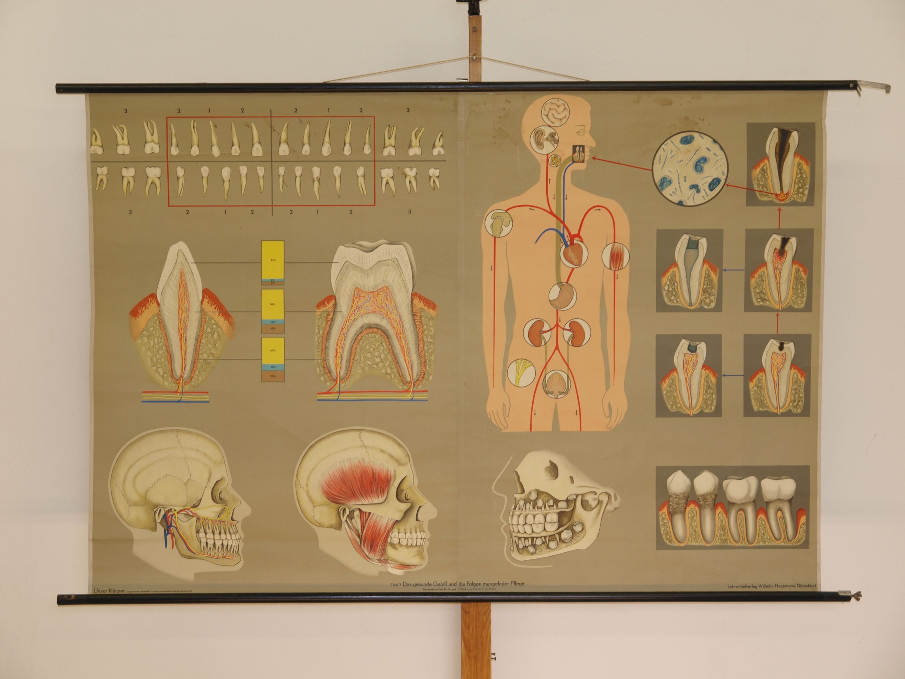 Gebiss Zähne Zahnarzt Kieferchirurg Lehrtafel Schaubild 1965 Wandbild 166x123cm NrL25 Unser Körper Tafel 7 Das gesunde Gebiß (KW281) Hagemann, 1965, 166x123cm plus Stäbe, oben Flecke powered by plentymarkets