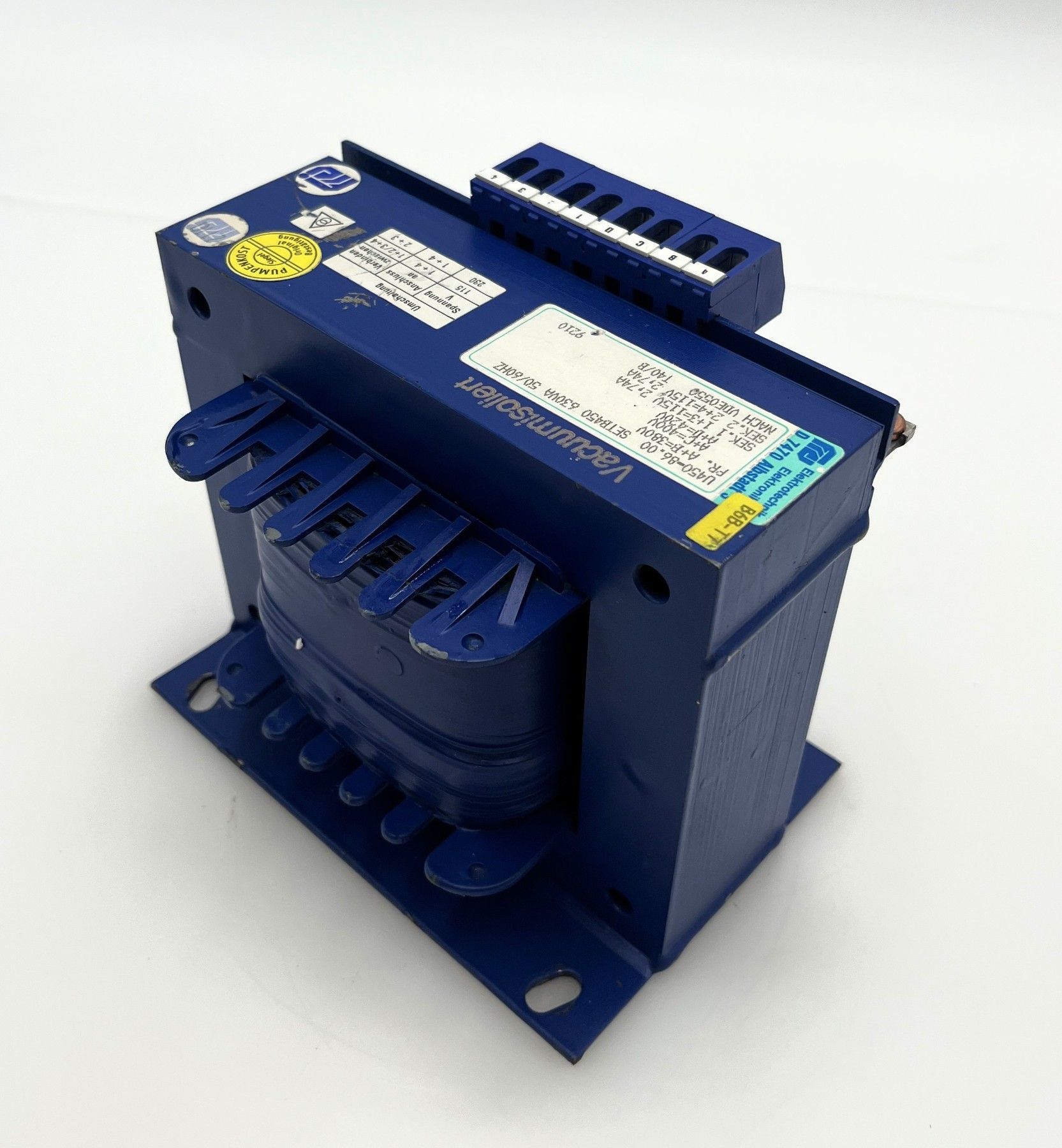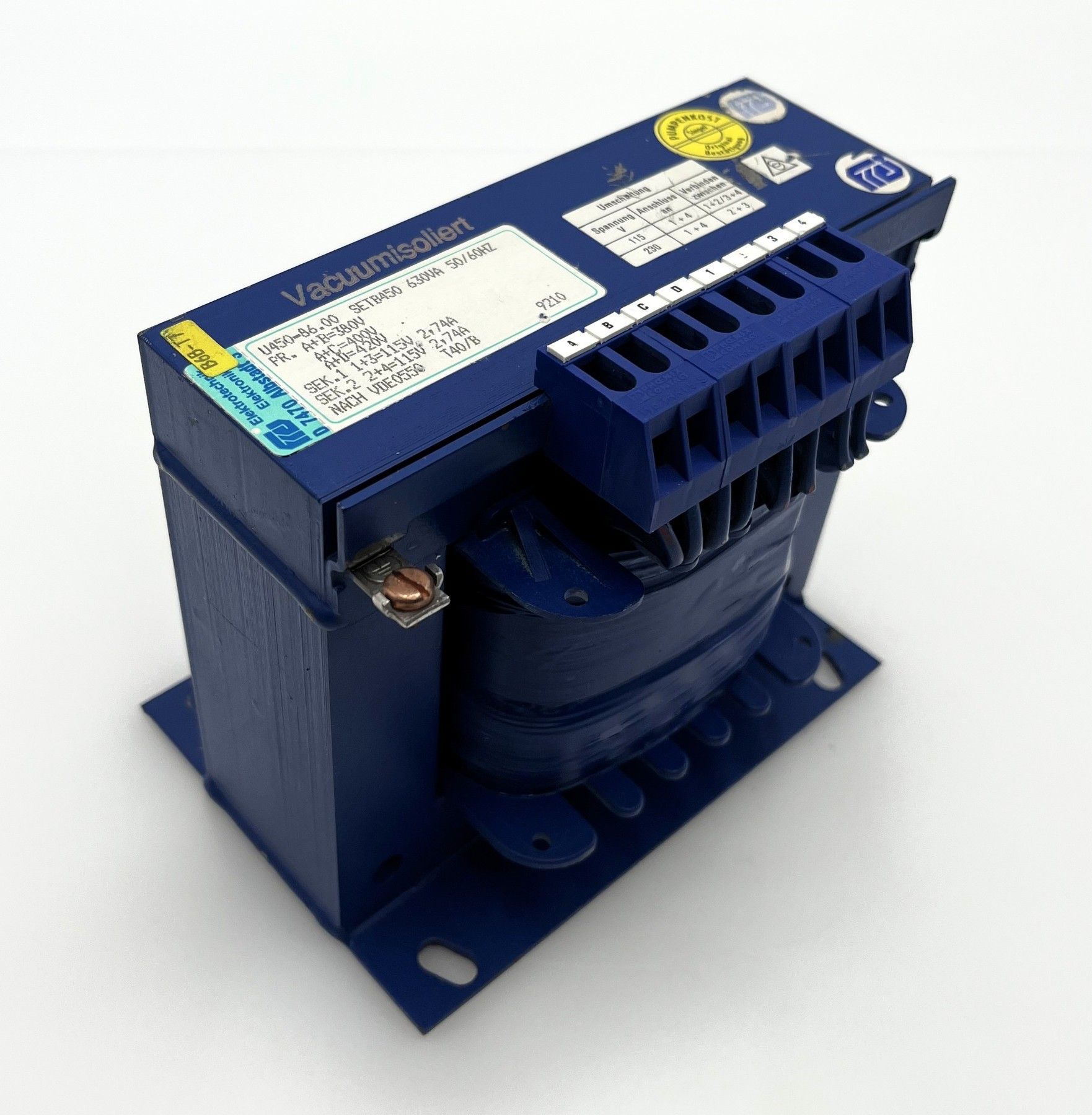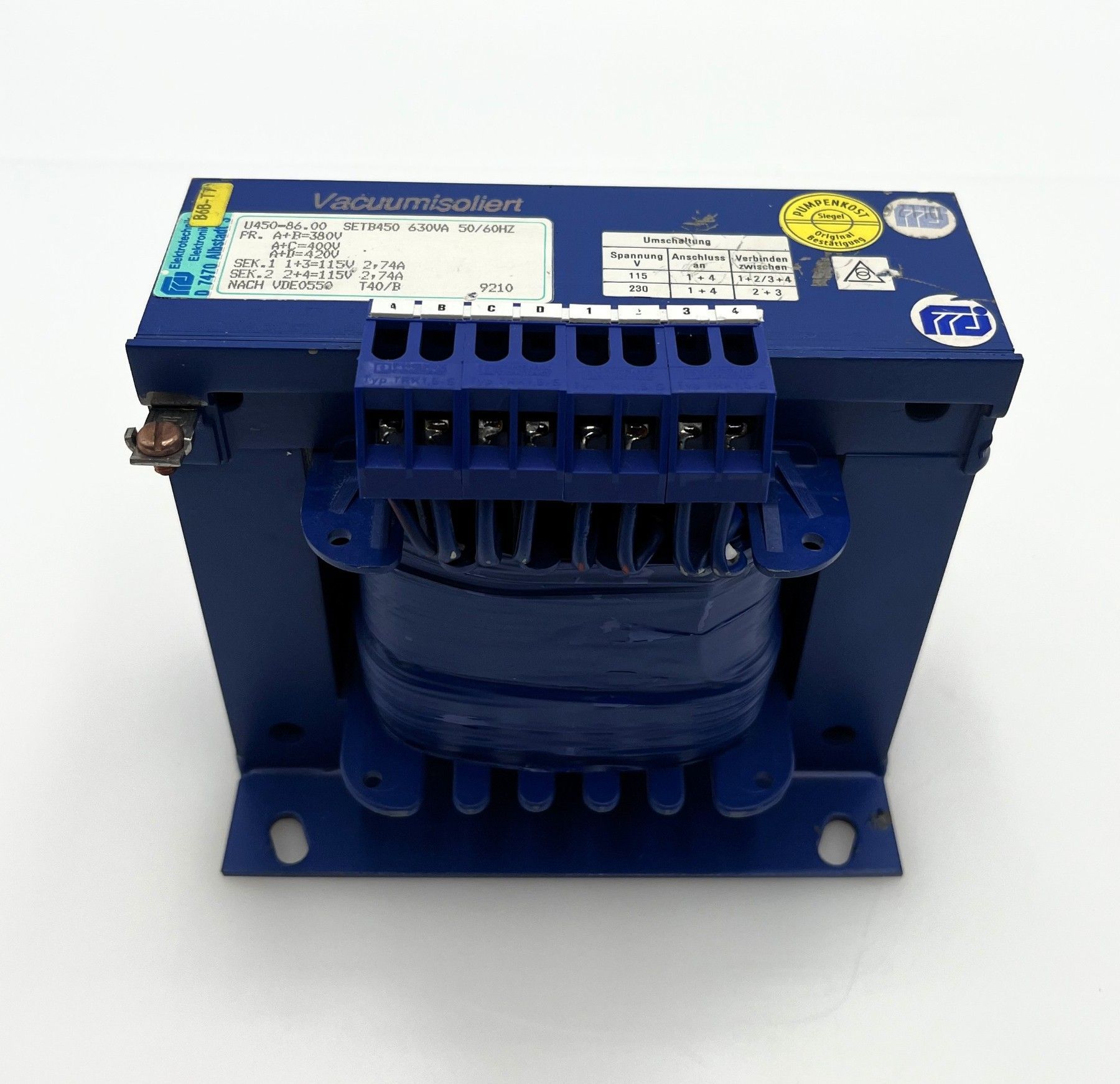 Gebrüder Frei SETB 450 Trafo Vacuumisoliert 630 VA Prim. 380, 400, 420 V Sec.1 = 115 V 2,74 A Sec.2 = 115 V 2,74 A Sec.3 = 230 V 2,74 A Gewicht: 7,74 kg Maße LxBxH:150x103x145 mm nach VDE 0550 Zustand: gebraucht (Top Zustand) Unsere Artikelnummer: T10 192 Sicherheitsprüfung nach VDE durchgeführt Sie