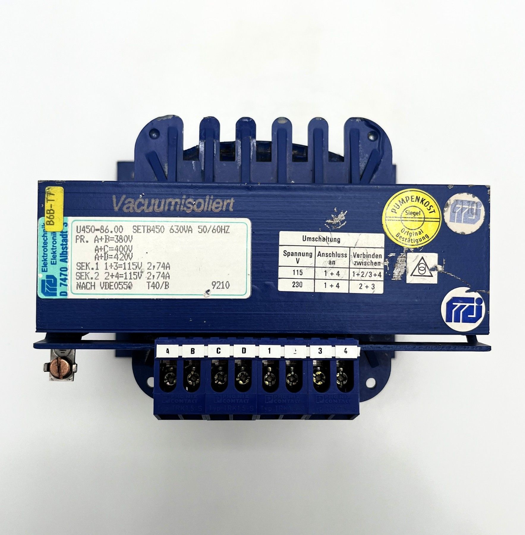 Gebrüder Frei SETB450 Trafo pri 380 400 420V sec 2x115V 230V 630VA T10/192