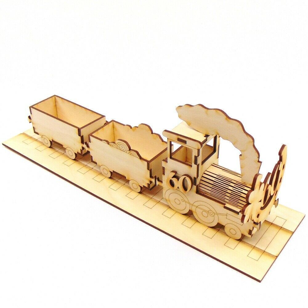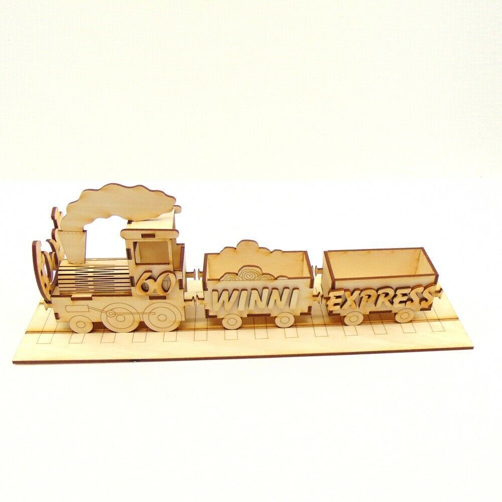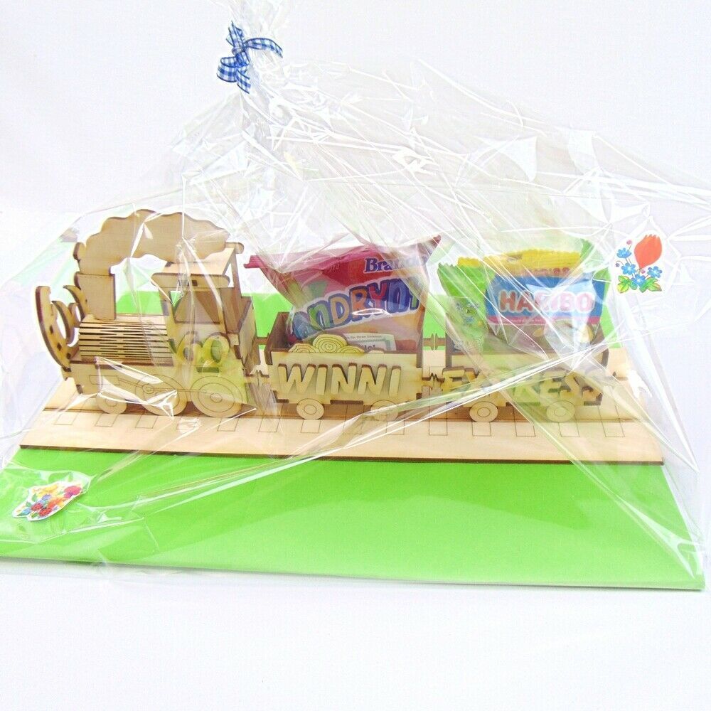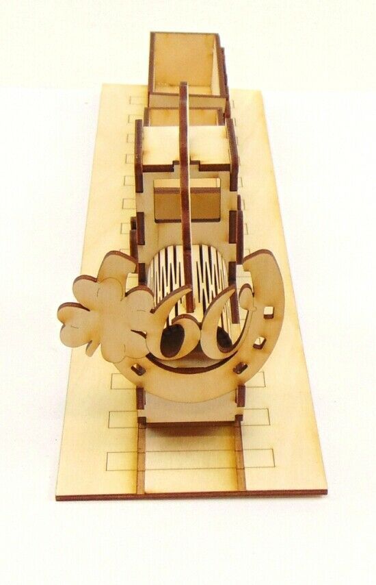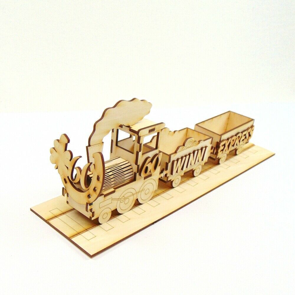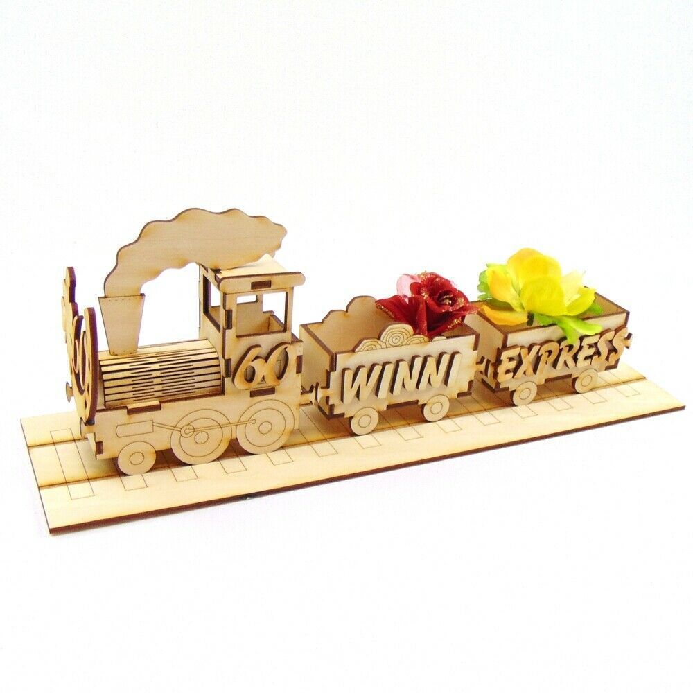 Bastelsatz Holz Zug mit 2 Wagons und einer Schienen Unterplatten zum Geburtstag. Das Hufeisen mit Kleeblatt und der beliebigen Geburtstagszahl senden wir Ihnen mit. 10, 18, 20, 25, 30, 35, 40, 45, 50, 55, 60, 65, 66, 70, 75, 80, 85, 90, 95, 100 diese Zahlen sind möglich. Bitte geben Sie nach dem Kau... Mehr