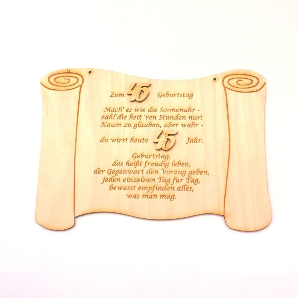 Geburtstagsgeschenk Glückwünsche auf einer Holztafel graviert zum 45. Geburtstag