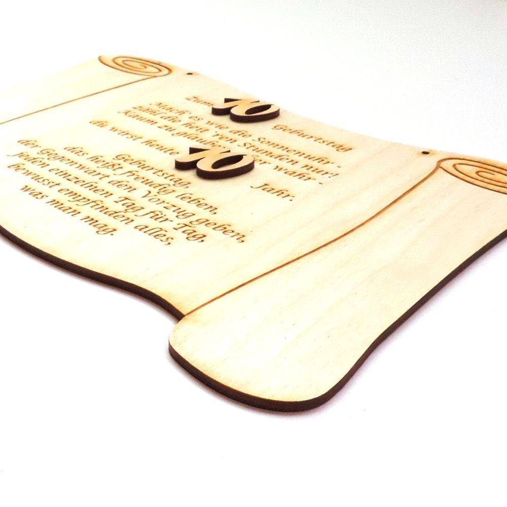 Papierrolle aus Holz mit Spruch und Zahl 10 Mit dieser tollen Geschenkidee liegen Sie garantiert richtig! 1 Holzplatte in Form einer Papierrolle mit graviertem Glückwunschspruch und aufgesetzter Zahl. Spruch wie auf dem Bild. Mach es wie die Sonnenuhr, zähl die heit´ren Stunden nur! ..... Die Platte