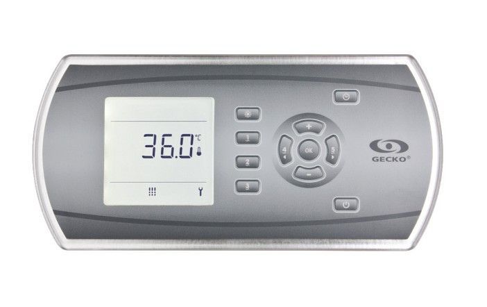 Gecko in.k600 Bedienfeld Dieses Bedienfeld hat 11 Tasten und einen großen Bildschirm. Es ist kompatibel mit den Gecko-Steuerungssystemen in.xe, in.xm and in.xm2, in.yj-3, in.ye-5 und in.yt-7. Es ermöglicht Ihnen, grundlegende Funktionen zu verwalten und die Filterzyklen Ihres Spas zu programmieren.